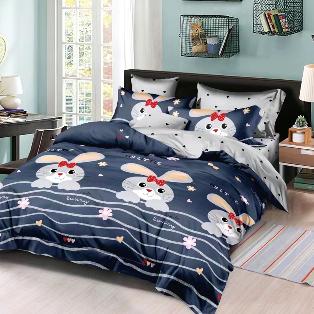 (OFERTA 3 la 199 Lei) Lenjerie pat dublu (140x200cm, 160x200cm, 180x200cm), bumbac satinat, cearsaf clasic, 4 piese, Albastru, Gri, Iepurasi, Dungi, Floricele