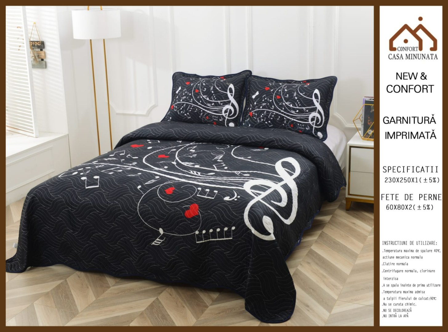 Cuvertura Matlasata, Pat Dublu, 230x250 cm, 3 Piese, Bumbac Finet Satinat, Imprimeu Digital, IDENTIC CU POZA, 2 Fete de Perna 60x80 cm, Negru, nota muzicala