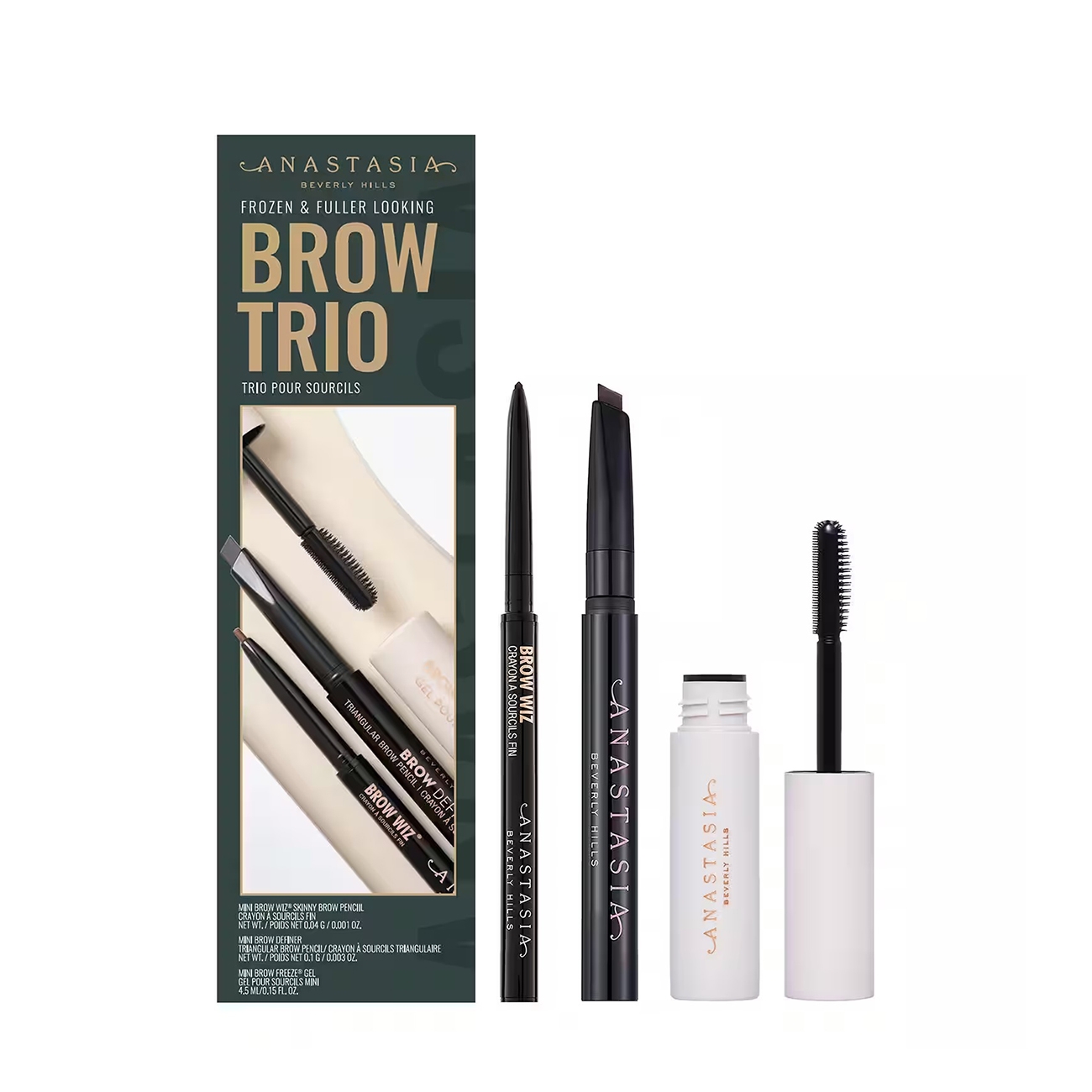 Anastasia Beverly Hills este un brand de frumusețe recunoscut la nivel global, cunoscut pentru inovațiile sale în îngrijirea sprâncenelor și produsele de machiaj. Anastasia Soare este fondatoarea brandului și a devenit rapid o influență majoră în industria cosmetică. Îmbunătățește-ți sprâncenele cu trio-ul suprem care le va face să arate mai pline și mai bine definite. Cu o formulă care imită aspectul părului, Brow Wiz este perfect pentru a contura și umple sprâncenele cu detalii fine. Deluxe Mini Brow Definer permite conturarea și nuanțarea sprâncenelor cu ușurință, oferind un aspect plin și definit. Deluxe Mini Brow Freeze Gel menține sprâncenele fixe pe tot parcursul zilei, prevenind estomparea sau îmbinarea lor.