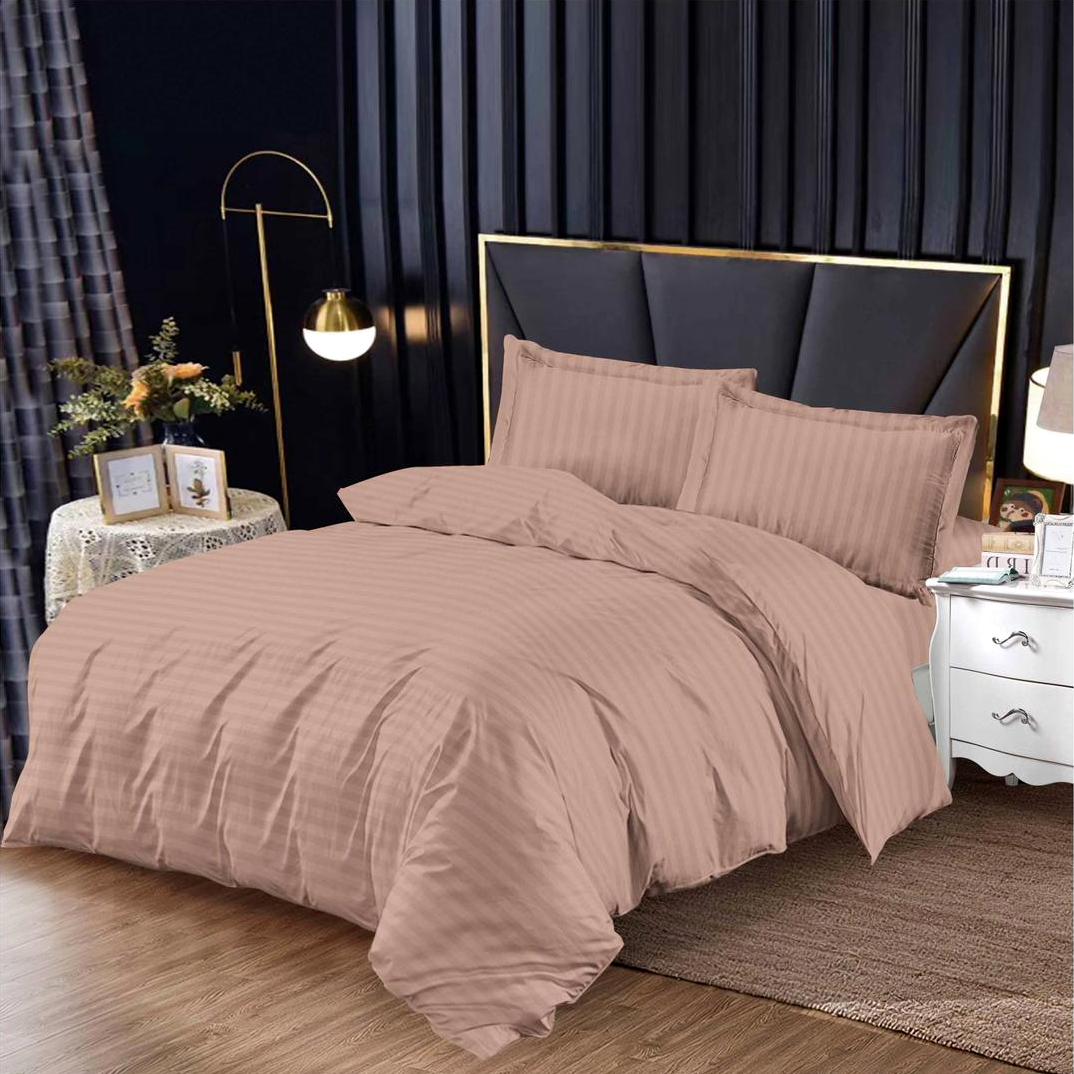Lenjerie de pat dublu tip damasc finetat, linear (tesatura din fabrica, ci nu imprimata, cu dunga de 1 cm grosime), confectionata din 70% bumbac + 30% microfibra din poliester, cu 4 piese, folosita cel mai mult in regimul hotelier, datorita simplitatii si calitatii extraordinare. Materialul are un aspect usor lucios pentru o nota de eleganta si rafinament, datorita tesaturii speciale. Damascul este recunoscut pentru rezistenta sa in timp la nenumarate spalari, nemodificandu-si aspe