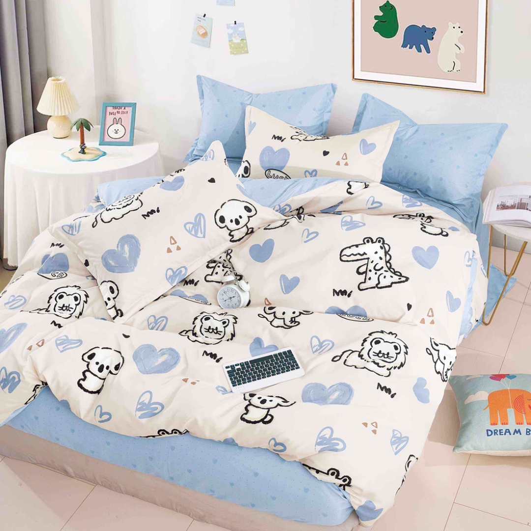 Lenjerie pat 1 PERSOANA, FINET, 4 piese, Jojo Home, Bej, Bleu, Animale, Inimioare