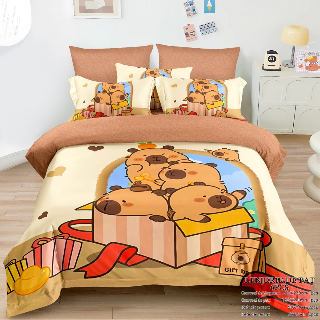 Lenjerie pat dublu (160x200cm, 180x200cm), FINET, cu ELASTIC, 6 piese, IDENTICA CU POZA, Bej, Maroniu, Capibare in cutie