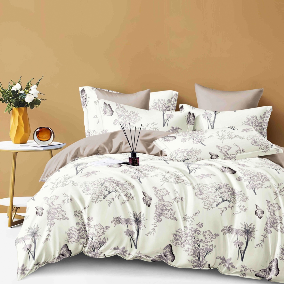 Lenjerie pat dublu, FINET, 6 piese, cu ELASTIC, Jojo Home, Crem, Bej, Flori