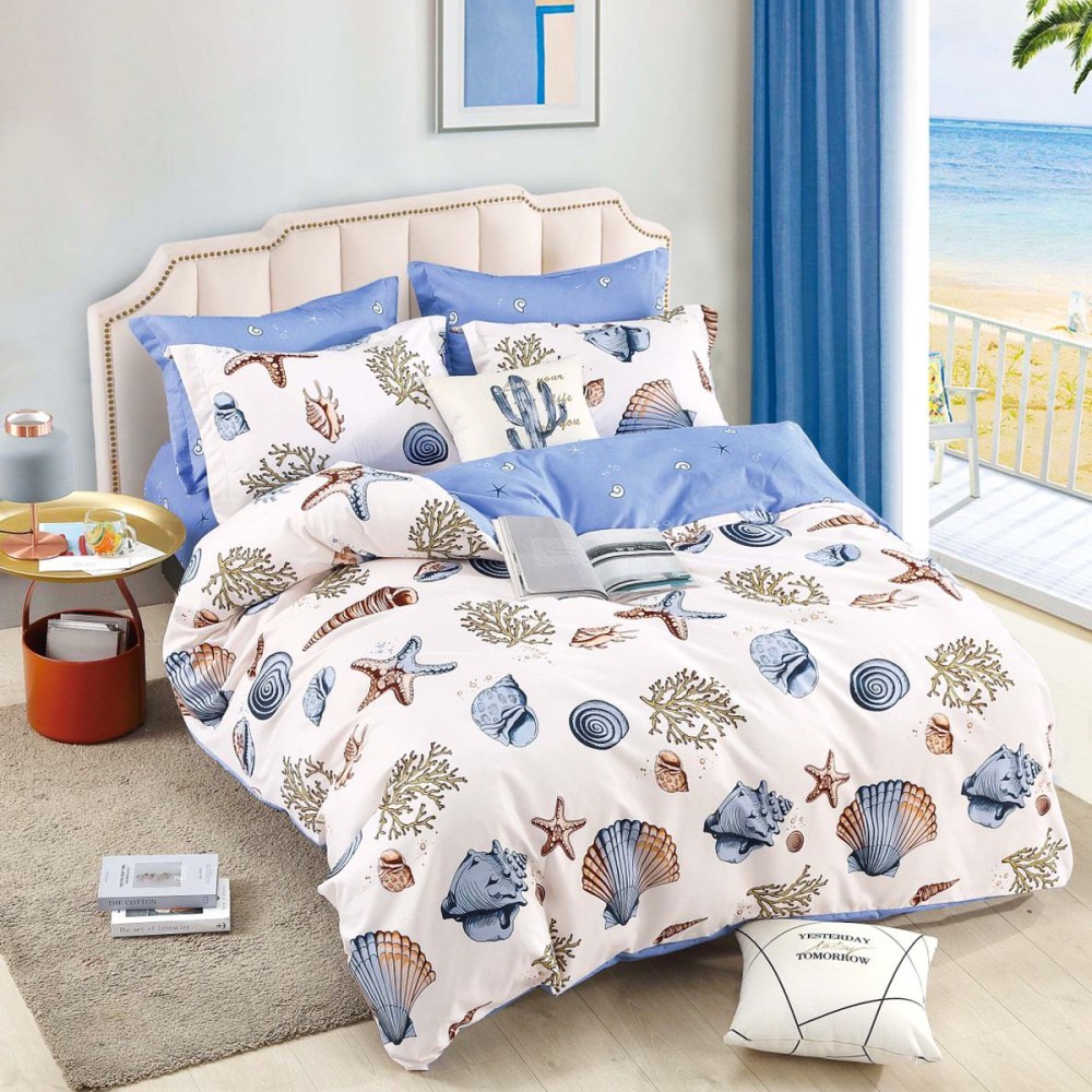 Lenjerie pat dublu, FINET, 6 piese, cu ELASTIC, Jojo Home, Crem, Bleu, Scoici si Melci