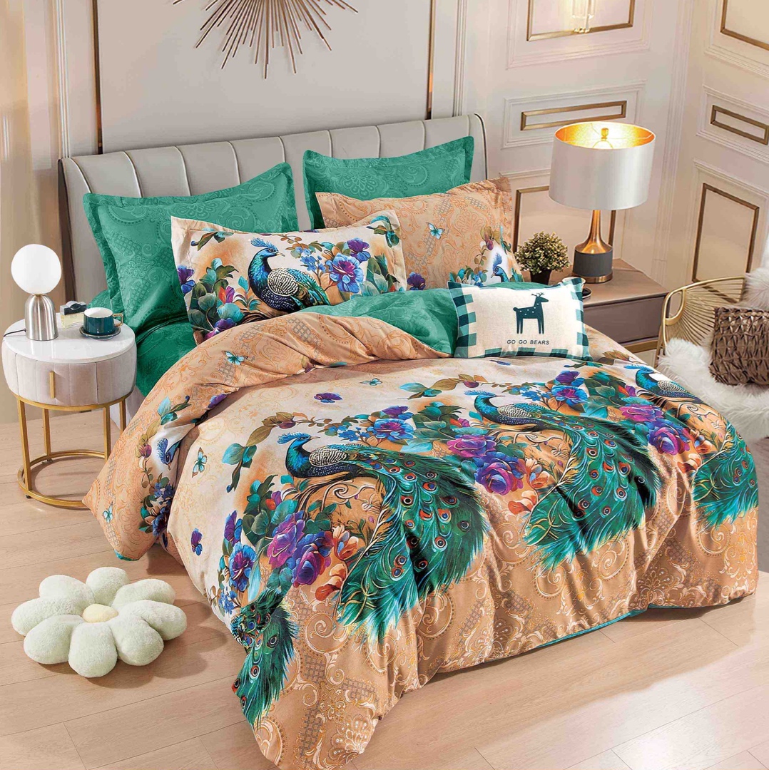 Lenjerie pat dublu, FINET, 6 piese, cu ELASTIC, Jojo Home, Verde, pauni