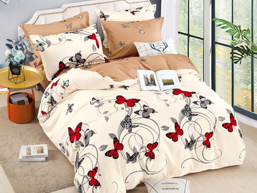 Lenjerie pat dublu, FINET, 6 piese, Jojo Home, Crem-Negru-Rosu, fluturi