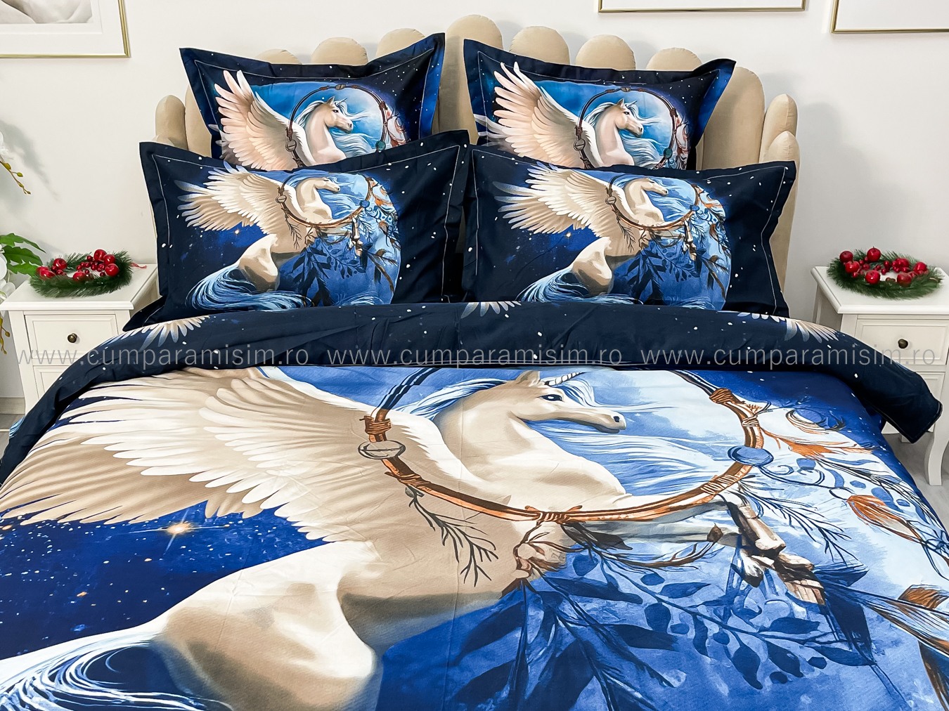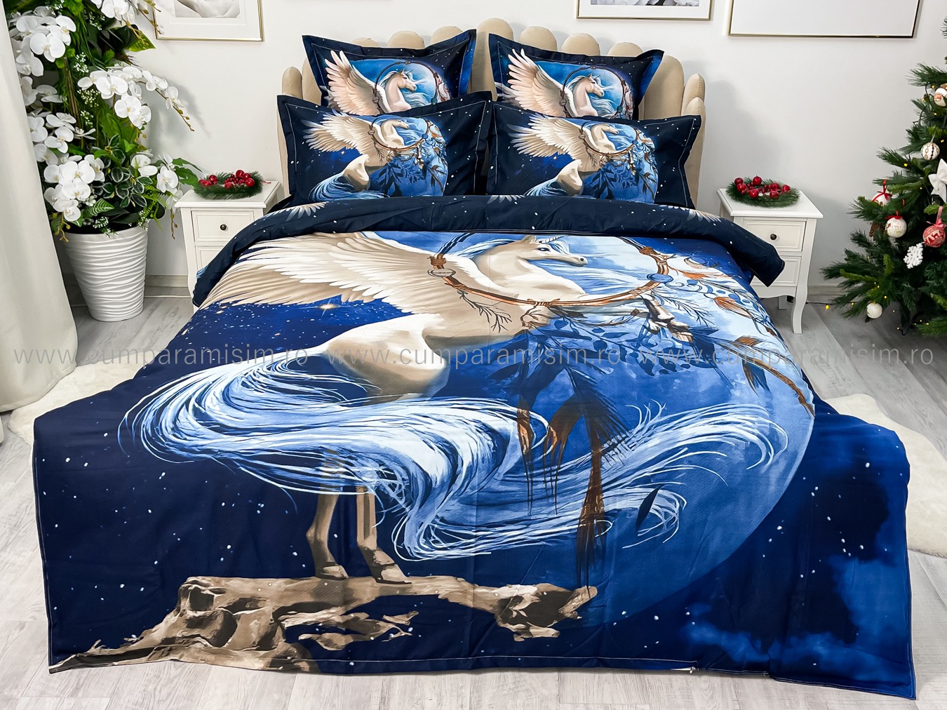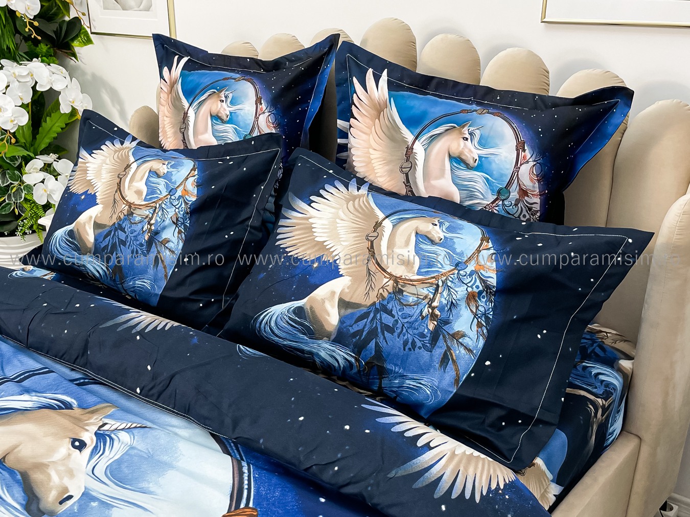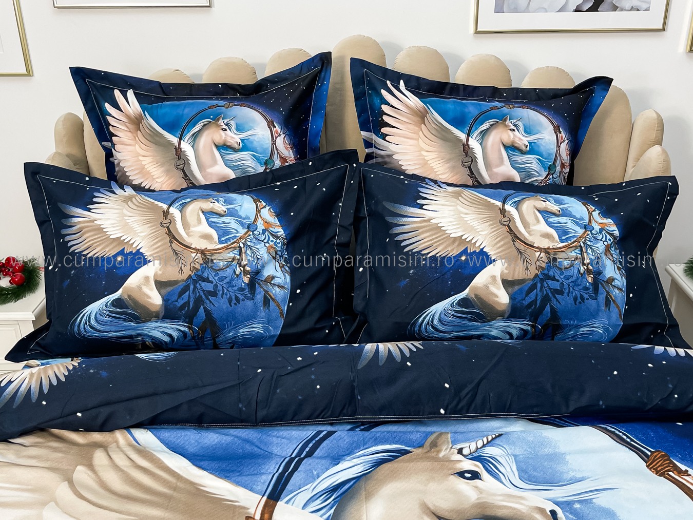 Lenjerie pat dublu, FINET, Imprimeu Digital - Identic cu poza, 6 piese, Jojo Home, Negru-Multicolor, unicorn