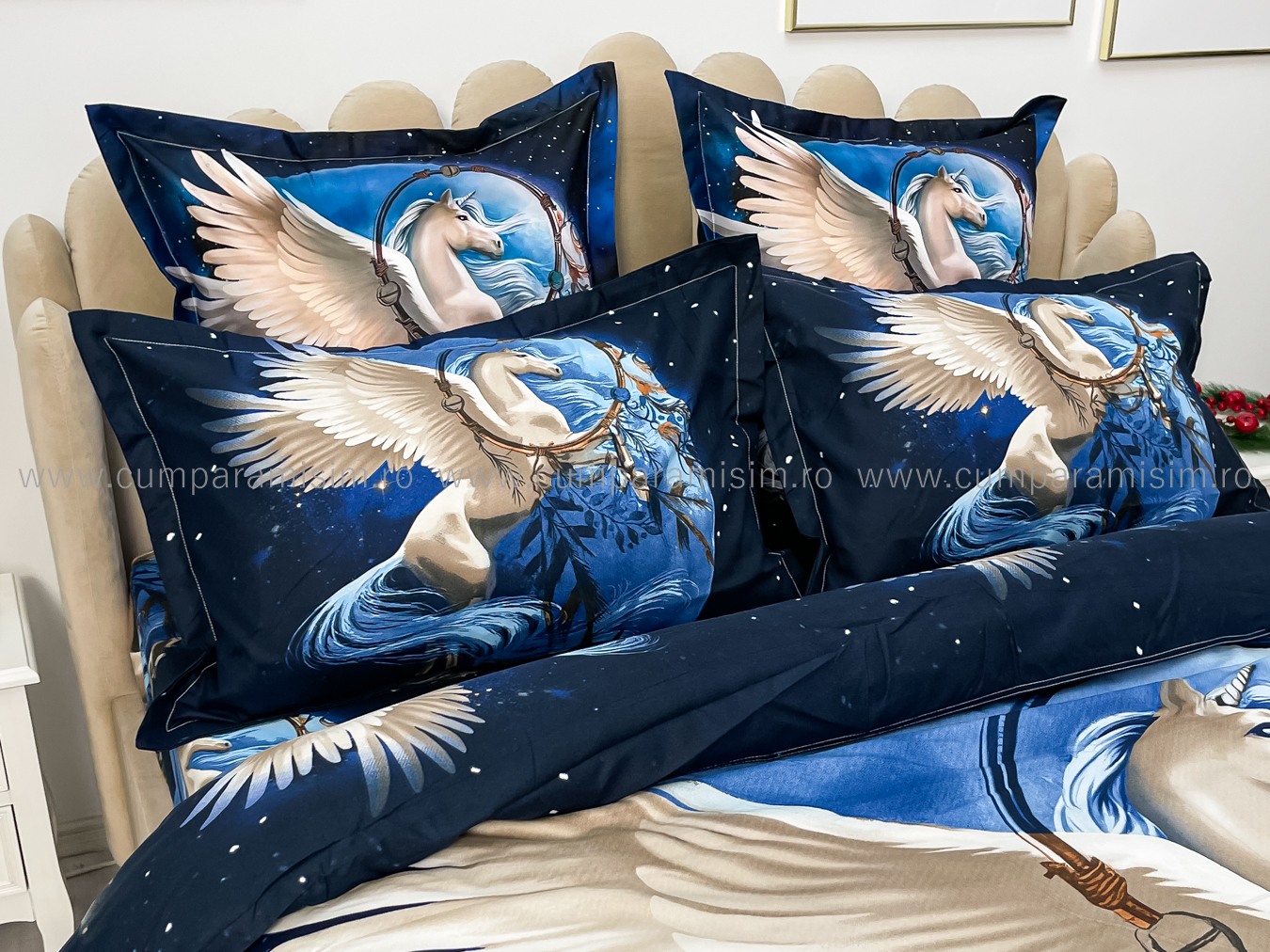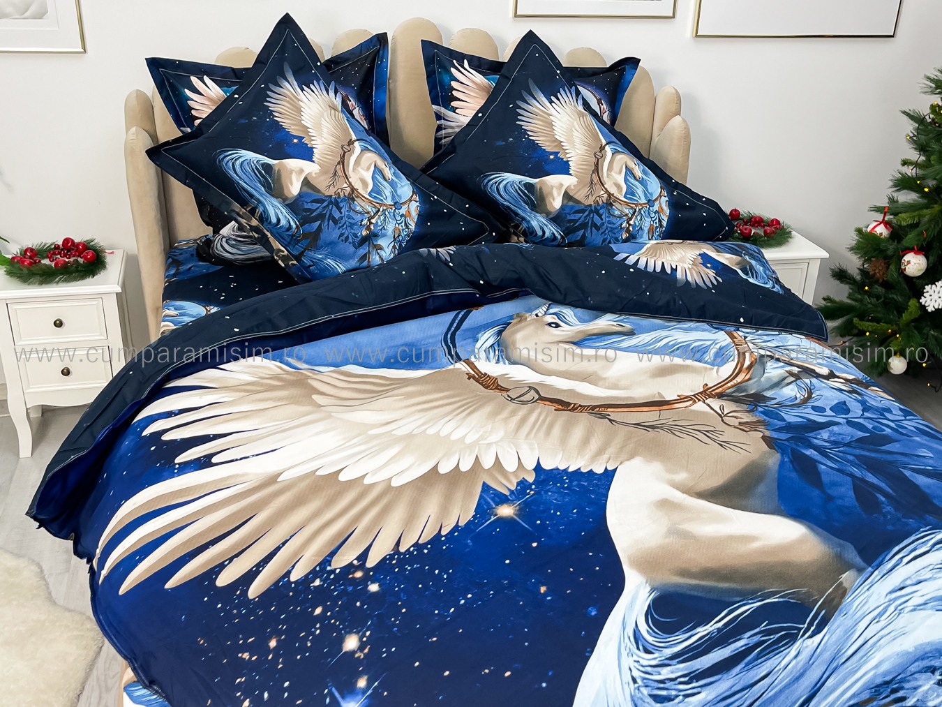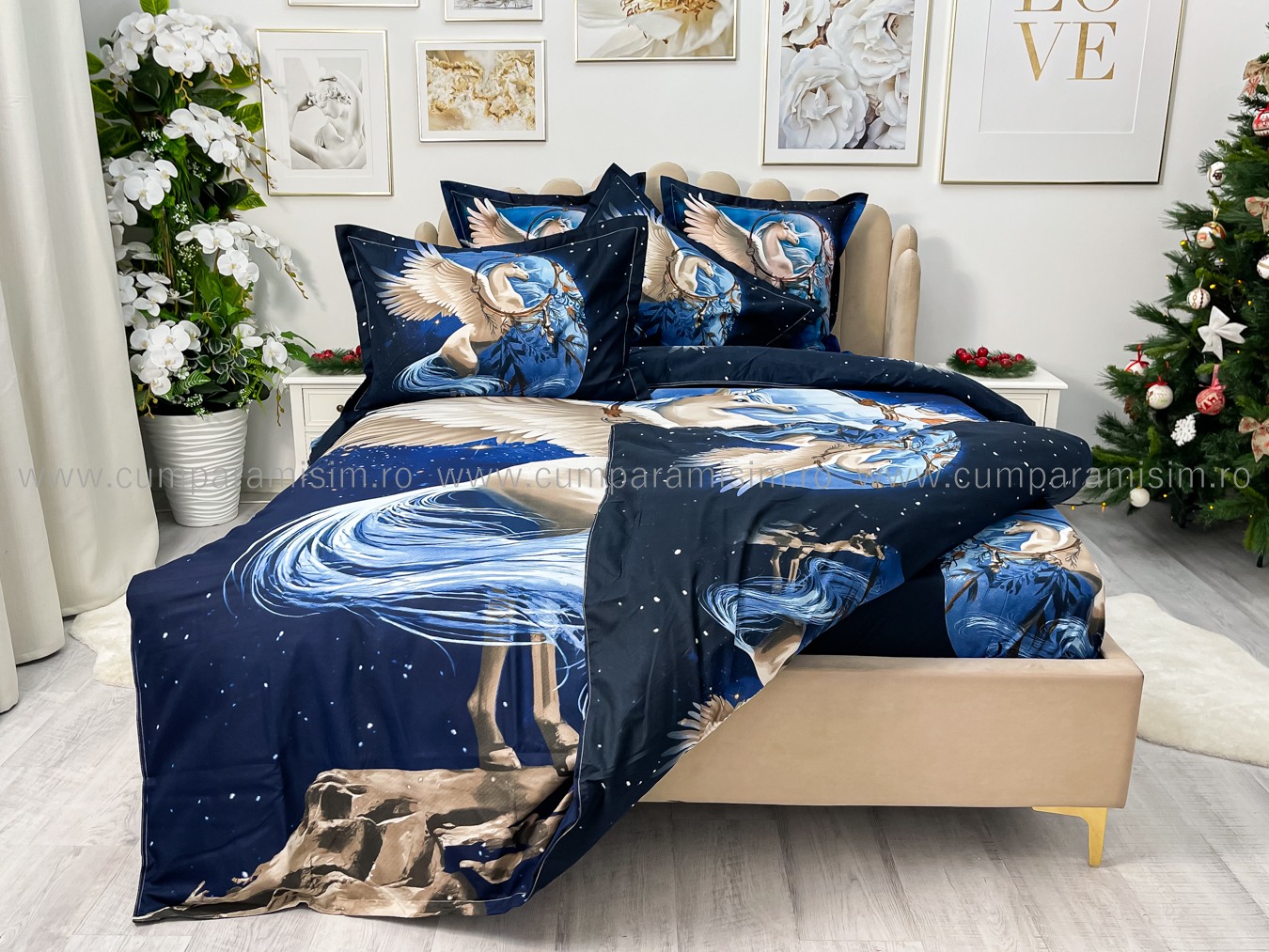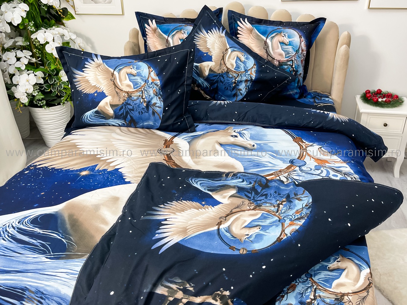 Lenjerie pat dublu, FINET, Imprimeu Digital - Identic cu poza, 6 piese, Jojo Home, Negru-Multicolor, unicorn