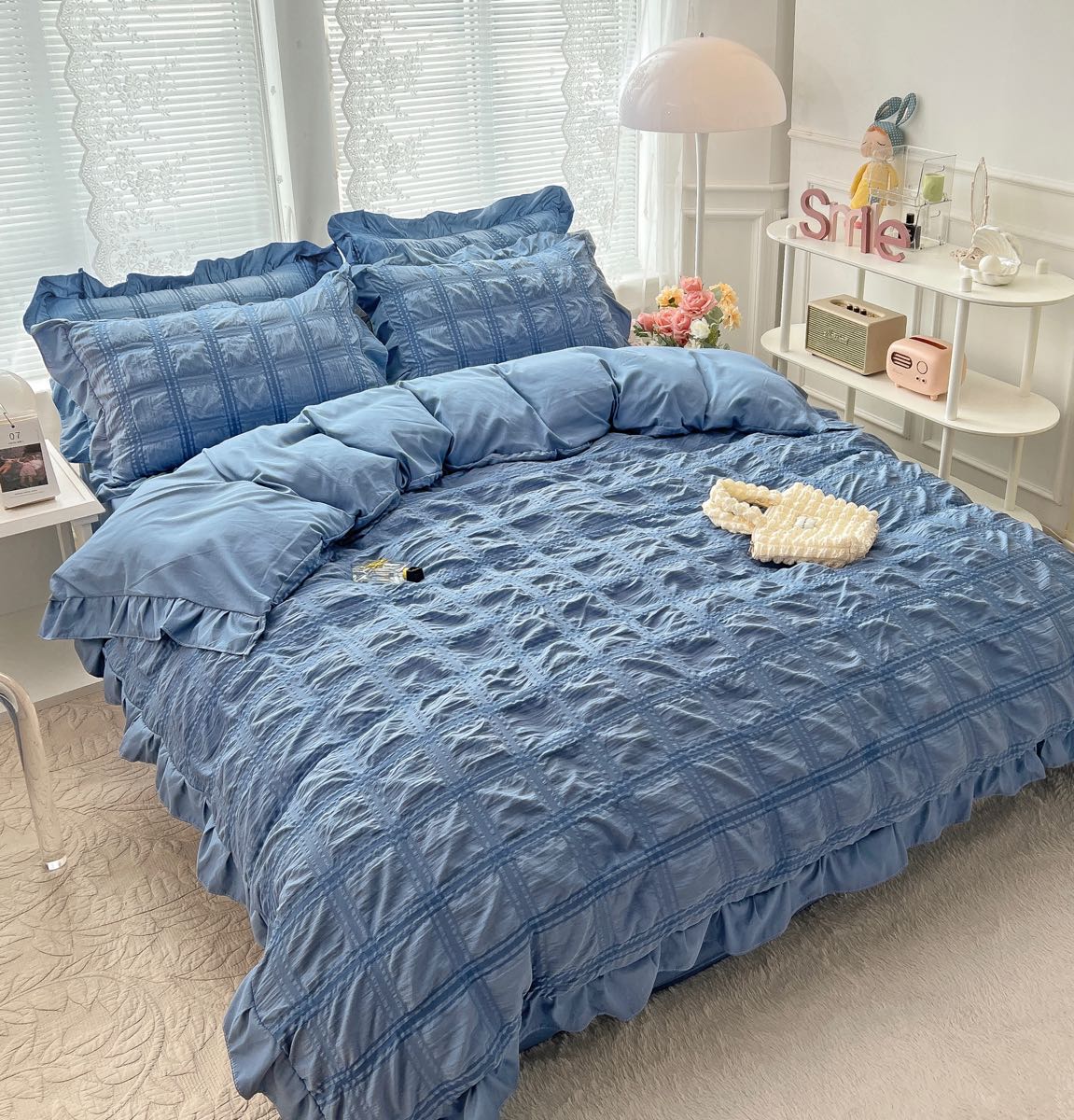 Lenjerie pat dublu, Soft Touch CREPONAT DELUXE, 6 piese, Jojo Home, Bleumarin