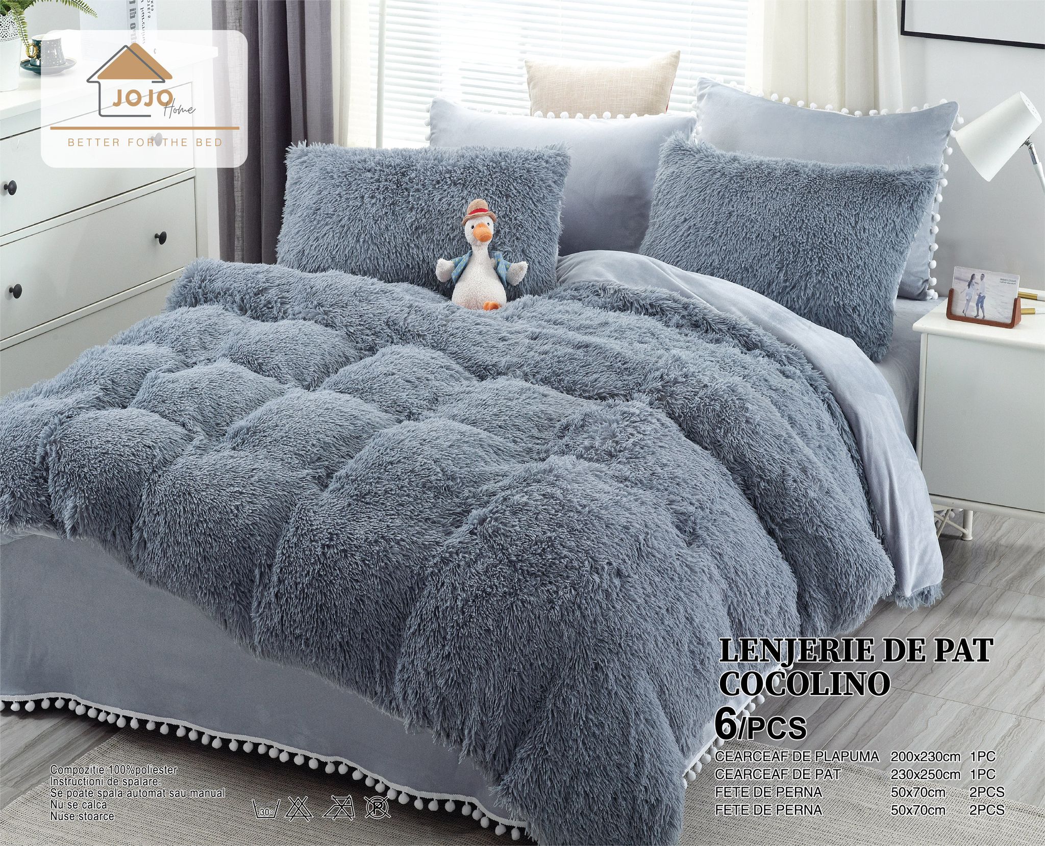 Lenjerie pufoasa COCOLINO cu 6 piese, pentru pat dublu. Produsul prezinta doua texturi de material cocolino, astfel incat cearsaful de pat, partea inferioara a cearsafului de pilota si partea inferioara a fetelor de perna sunt din microfibra plusata fina; cearsaful de pilota pe fata principala si fetele de perna sunt din cocolino(microfibra) super pufos, fluffy. Denumirea Cocolino ne duce cu gandul la ursuletii de plush, adorabili si pufosi, dar e bine de stiut ca asternuturile de aces