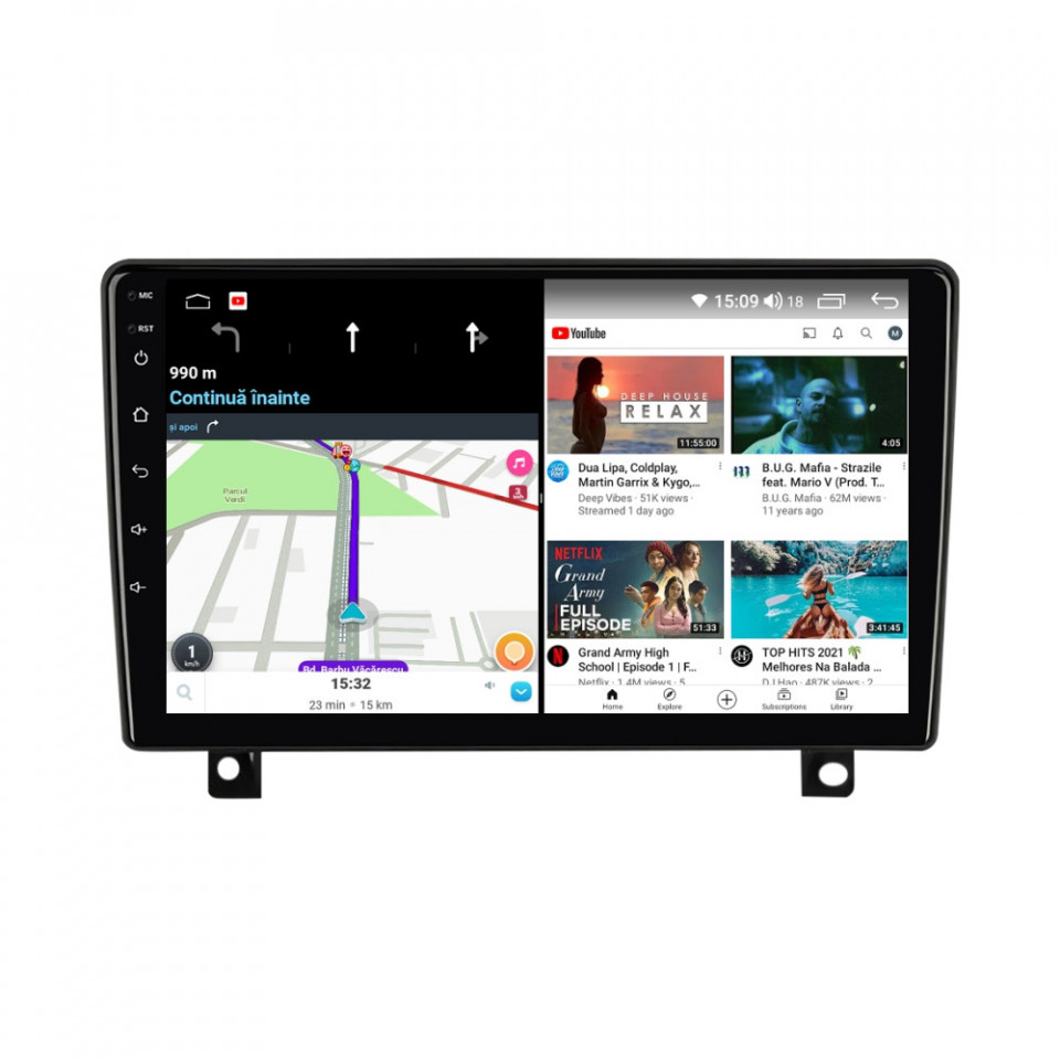 Sistem de operare: Car Android 14 cu meniu în peste 60 de limbi (inclusiv limba română) Procesor: Octa Core UIS7862S 2GHz Memorie internă: 4GB RAM + 32GB stocare (extensibilă prin 3 sloturi USB de maxim 64GB) Display: Touchscreen 9 inch QLED HD 1280x720, multi-touch, format 16:9, cu margini curbate și tehnologie 2.5D Chipset GPS: Samsung Sirf Star IV cu 48 de canale (antenă GPS inclusă) Fast Boot: Navigația pornește instant în momentul în care se pune contactul Conectivitate: Slot SIM 4G, Wi-Fi Dual Band 2.4Ghz si 5Ghz, Bluetooth, 3 x USB, RCA, AUX Plug & Play: Mufă dedicată, navigaţia preia comenzile de pe volanul maşinii şi nu descarcă bateria acesteia Cooler răcire activă: Ventilatorul integrat menține o temperatură optimă, asigurând astfel navigației o durată de viaţă mai mare Audio: 4 x 45W + ieşire subwoofer, egalizator și procesor de sunet DSP Radio: FM (87.5 - 108.0 Mhz) şi AM (522 - 1620 Khz) cu funcție RDS Dual Zone: Poţi asculta muzică şi folosi aplicaţia preferată de navigare (iGO, Waze, Maps etc.) în acelaşi timp PLUG & PLAY Navigația se potrivește perfect în bord, iar mufa este identică cu cea a maşinii. Nu ai nevoie de altă ramă şi nu trebuie să modifici instalaţia electrică. Comenzile de pe volan rămân funcţionale, iar navigaţia se va opri când iei contactul şi nu va descărca bateria maşinii. În pachet sunt incluse toate cablurile necesare montării navigaţiei, precum şi cele auxiliare (RCA, USB etc.). UNIVERSUL ANDROID ÎN CONFORTUL MAŞINII TALE Aplicaţiile preferate vin acum pe ecranul navigaţiei tale. Poţi instala orice aplicaţie din magazinul Google Play: Waze, Google Maps, YouTube, Spotify, Google Chrome, Instagram, Facebook, WhatsApp etc. Fără a mai avea nevoie de telefon, te poţi strecura prin traficul aglomerat folosind Waze sau Google Maps şi în acelaşi timp poţi asculta muzica preferată sau viziona filmele și videoclipurile favorite pe YouTube, Spotify, Apple Music etc. GPS DUAL ZONE Navigaţia dispune de un modul şi o antenă GPS de calitate superioară, care te localizează cu precizie şi te ajută să ajungi la destinaţie în cel mai scurt timp, fără a avea nevoie de telefon. Dual zone: Poţi asculta muzică în timp ce foloseşti aplicaţia preferată de navigare, vocea aplicaţiei suprapunându-se, atunci când este cazul, peste muzică. COMPATIBILĂ CU ORICE TELEFON Deşi navigaţia dispune de propriul sistem de operare Android care funcţionează independent de telefon, la aceasta se poate conecta orice telefon cu Android sau iPhone prin Bluetooth sau Wi-Fi. Poţi folosi cu uşurinţă aplicațiile instalate pe telefon prin intermediul Android Auto sau Apple CarPlay şi primeşti toate notificările de pe telefon pe ecranul navigaţiei. SLOT SIM 4G, BLUETOOTH, WI-FI ŞI MIRRORLINK INTEGRATE Spune adio amenzilor pentru folosirea telefonului la volan. Poţi descărca agenda telefonică pe navigaţie şi poţi iniţia şi prelua apeluri de pe ecranul navigaţiei, precum şi asculta muzica preferată de pe telefon. Navigaţia se conectează rapid la orice reţea wireless, inclusiv la hotspot-ul telefonului, precum și la internet 4G, introducând o cartelă cu internet în slotul SIM. Cu ajutorul tehnologiei MirrorLink poţi beneficia de funcțiile Android Auto sau Apple CarPlay. MULTIPLE INTERFEȚE DISPONIBILE Interfața navigației se poate schimba cu ușurință, aceasta având 4 teme preinstalate, astfel încat să se plieze pe stilul și gustul tau. De asemenea, o poți personaliza foarte ușor cu alte teme disponibile în aplicații de tip Car Launcher. Nu trebuie să ştii engleză pentru a putea folosi navigaţia. Poţi afişa meniul în peste 60 de limbi, inclusiv română, engleză, spaniolă sau franceză. SUPORT DVR, CAMERĂ MARȘARIER ȘI SENZORI PARCARE AFTERMARKET Niciodată nu a fost atât de simplu să parchezi. Când schimbătorul ajunge în marșarier, pe ecranul navigației se va afișa automat imaginea video din spatele mașinii, împreună cu liniile de ghidaj. Senzorii de parcare, fiind de asemenea afişaţi pe navigaţie, te vor avertiza atât vizual, cât şi acustic. Înregistrarea video realizată de camera de bord DVR te poate scăpa de amenzi sau alte situaţii neplăcute, fiind martorul tău de încredere în cazul producerii unui eveniment nedorit în trafic. SUPORT INTERFAȚĂ OBDII Un adaptor Bluetooth OBDII este de un real ajutor atunci când o eroare apare în bordul maşinii. Cu ajutorul lui poţi citi, interpreta sau șterge eventualele coduri de eroare şi îţi poţi da seama cu uşurinţă ce nu este în regulă cu maşina ta. În plus, poți afișa pe ecranul navigației informații în timp real despre starea mașinii cu ajutorul unor aplicații dedicate precum Torque sau Car Scanner. NAVIGAȚIE CU ANDROID - SISTEMUL COMPLET DE INFOTAINMENT DIN MAȘINA TA
