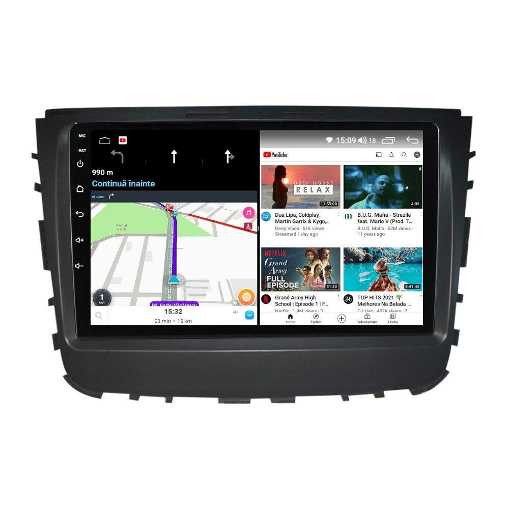 Navigatie dedicata cu Android Ssangyong Musso dupa 2018, 4GB RAM, Radio GPS Dual Zone, Display HD QLED 9 Touchscreen, Internet Wi-Fi si slot SIM 4G, Bluetooth, MirrorLink, USB, Waze