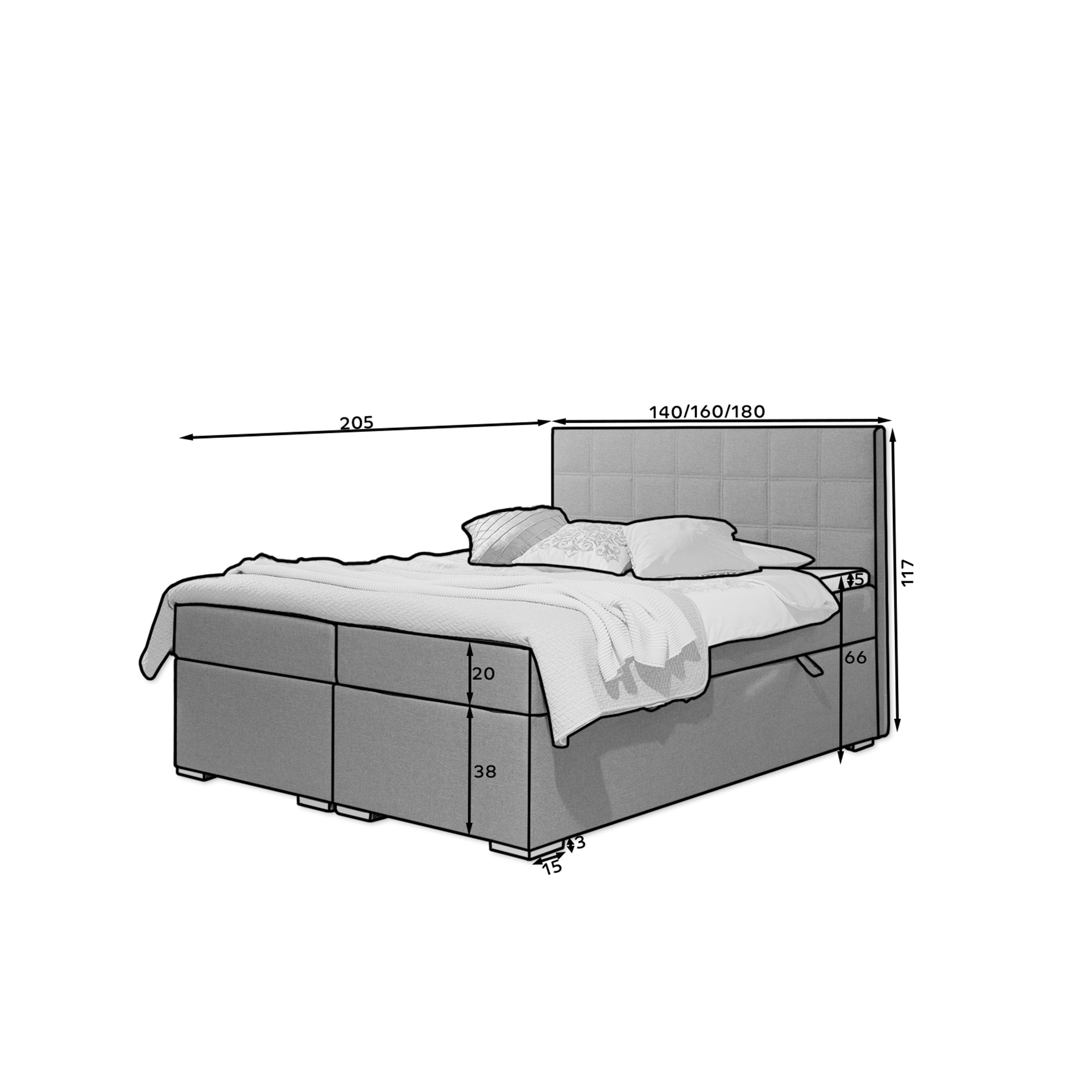 Patul boxspring Alice este alegerea perfecta pentru cei care doresc un somn odihnitor si un design rafinat. Cu o combinatie de confort si fermitate, Alice este un pat care nu doar arata elegant, ci si sustine un somn sanatos si relaxant. Patul boxspring Alice se remarca prin salteaua sa groasa, impreuna cu o tablie inalta si moale, decorata cu cusaturi patrate elegante. Picioarele joase, finisate in argintiu, adauga un aer modern si sofisticat, ceea ce face ca acest pat sa fie ideal pe