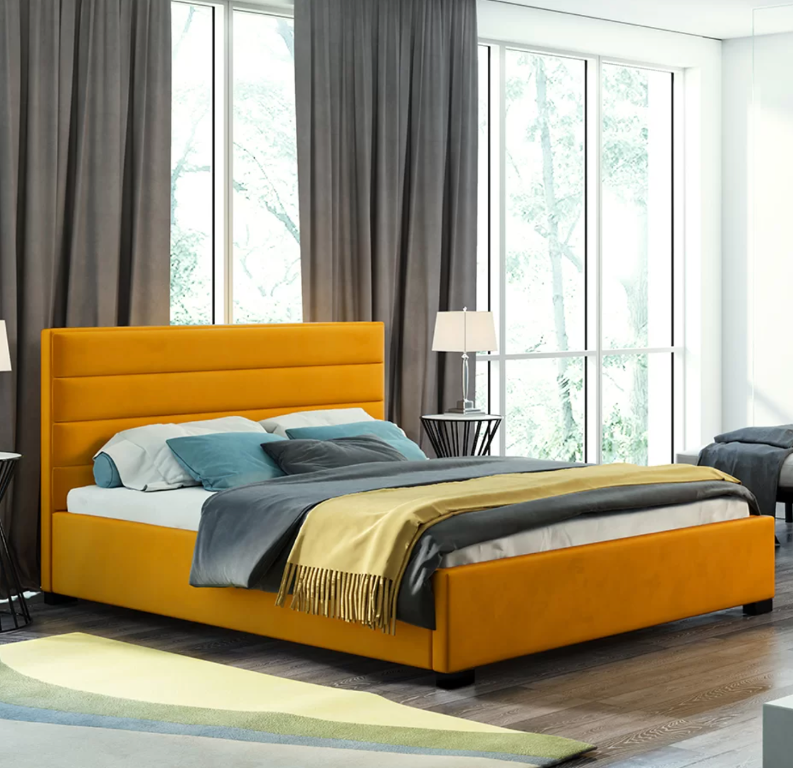Pat matrimonial tapitat cu material plusat, tablie tapitata tip cusaturi, somiera rabatabila, lada pentru depozitare. Subcategorii:Simple Pozitionare:De mijloc Pentru saltea de:140 x 200 cm Somiera:Rabatabila Material tapiterie:Catifea Culoare:Galben Picioare:5 cm Material picioare:Plastic Dimensiune totala:223 x 155 cm Tablie:Tip cusaturi Inaltime tablie:110 cm Inaltime cadru:33 cm Structura:Lemn, PAL Depozitare:Lada Provenienta:Proprie Un pat cu linii moderne orizontale pe ta