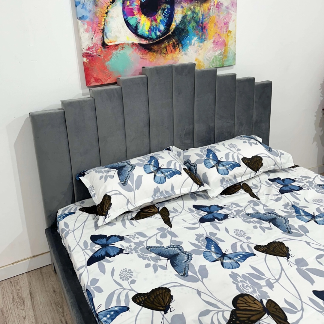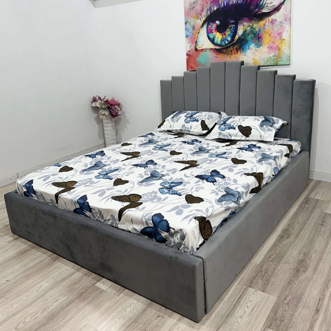 Tablie inalta captusita cu cusaturi distinctive, rezistenta si stabilitatea garantate de un cadru realizat din lemn si PAL nemelaminat, picioare rezistente din metal, somiera rabatabila inclusa in pret, spatiu depozitare generos.     La comanda se poate realiza si fara somiera, suportul pentru saltea fiind drept, din PAL nemelaminat, sustinut de un sistem tip fagure, foarte rezistent.     Acest superb pat tapitat este o adevarata piesa de arta care nu numai ca va va decora camera,