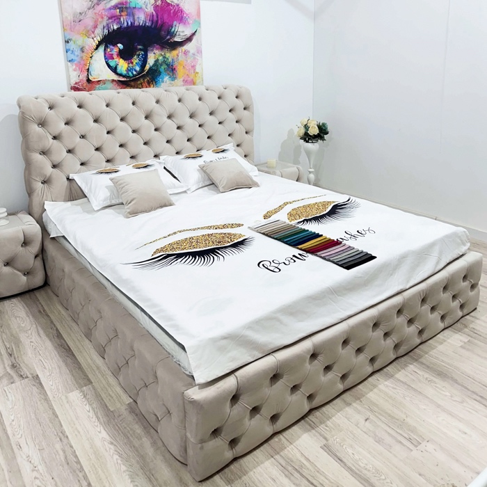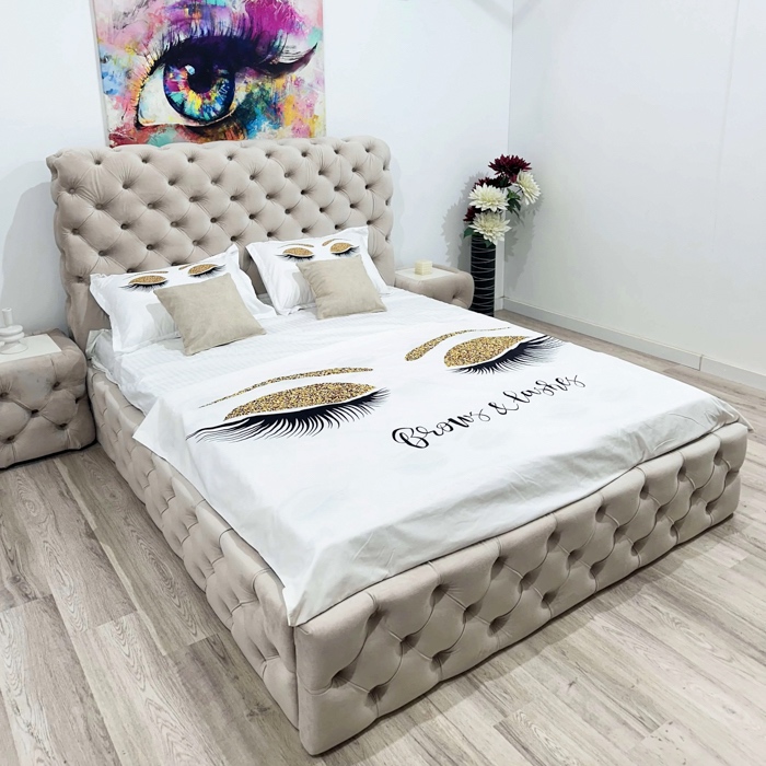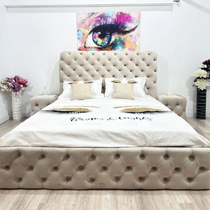 Pat Matrimonia, pentru Saltea de 180x200cm, Tapitat din Catifea, tip Chesterfield, Bej deschis - model LUXURY - cu Somiera Rabatabila