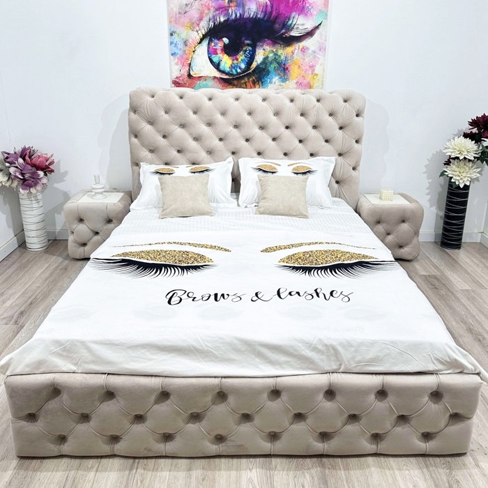 Pat tapitat de mijloc cu tablie inalta in stil Chesterfield pentru saltea de 180 x 200 cm, material catifelat, cu somiera rabatabila..     La comanda nasturii pot fi si din sticla.     Noptiere la comanda: 500 lei/bucata.     Patul matrimonial Luxury redefinește eleganța în dormitor prin combinația perfectă între design sofisticat, materiale premium și funcționalitate inteligentă. Tapițat cu catifea fină, acest pat matrimonial modern impresionează prin tablia înaltă d