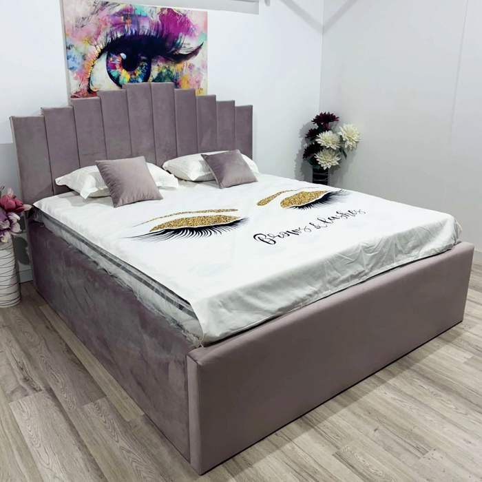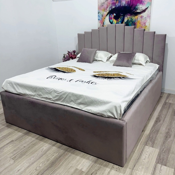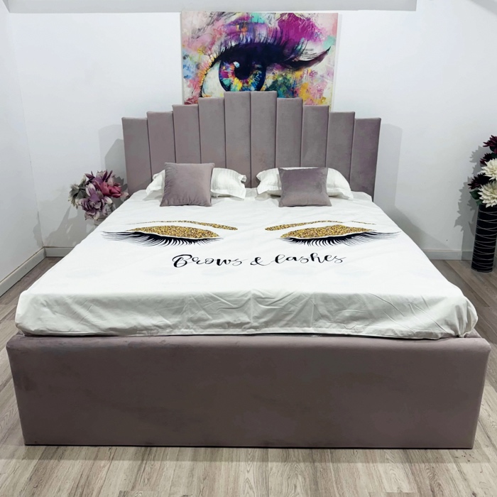 Tablie inalta captusita cu cusaturi distinctive, rezistenta si stabilitatea garantate de un cadru realizat din lemn si PAL nemelaminat, picioare rezistente din metal, somiera rabatabila inclusa in pret, spatiu depozitare generos. La comanda se poate realiza si fara somiera, suportul pentru saltea fiind drept, din PAL nemelaminat, sustinut de un sistem tip fagure, foarte rezistent. Acest superb pat tapitat este o adevarata piesa de arta care nu numai ca va va decora camera,