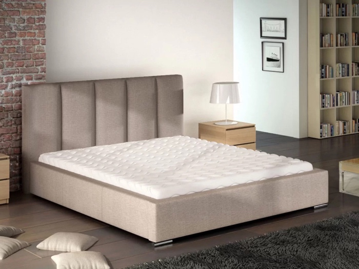 Pat matrimonial tapitat cu stofa de calitate superioara, tablie inalta cu model tip cusaturi, somiera rabatabila, lada de depozitare, picioare din metal. La comanda se poate realiza si fara somiera, suportul pentru saltea fiind drept, din PAL nemelaminat, sustinut de un sistem tip fagure, foarte rezistent. Simplitatea si modernitatea se imbina perfect in acest model inedit de pat ce va aduce stil si confort in dormitorul dumneavoastra. Nuanta cappuccino a stofei ii va p