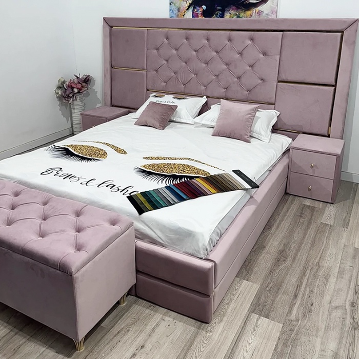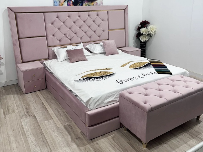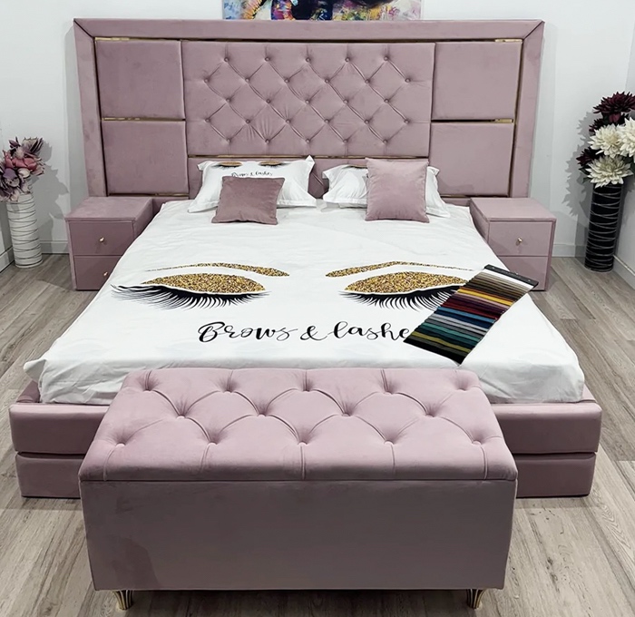 Pat matrimonial de mijloc pentru saltea de 140 x 200 cm, tapiterie in stil Chesterfield cu accesorii aurii, material catifelat, somiera rabatabila, lada generoasa de depozitare, structura rezistenta formata din lemn si PAL melaminat, doua noptiere tapitate si un taburet. La comanda, insertiile aurii pot fi inlocuite cu insertii argintii si de asemenea cu accesorii confectionate din stofa, in functie de alegerea dumneavoastra. Dormitorul este spatiul ce necesita confort pen