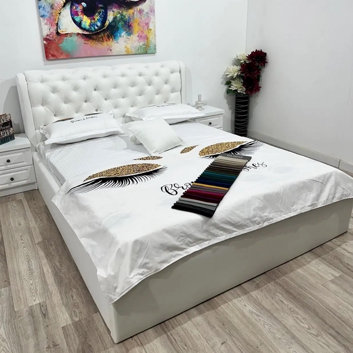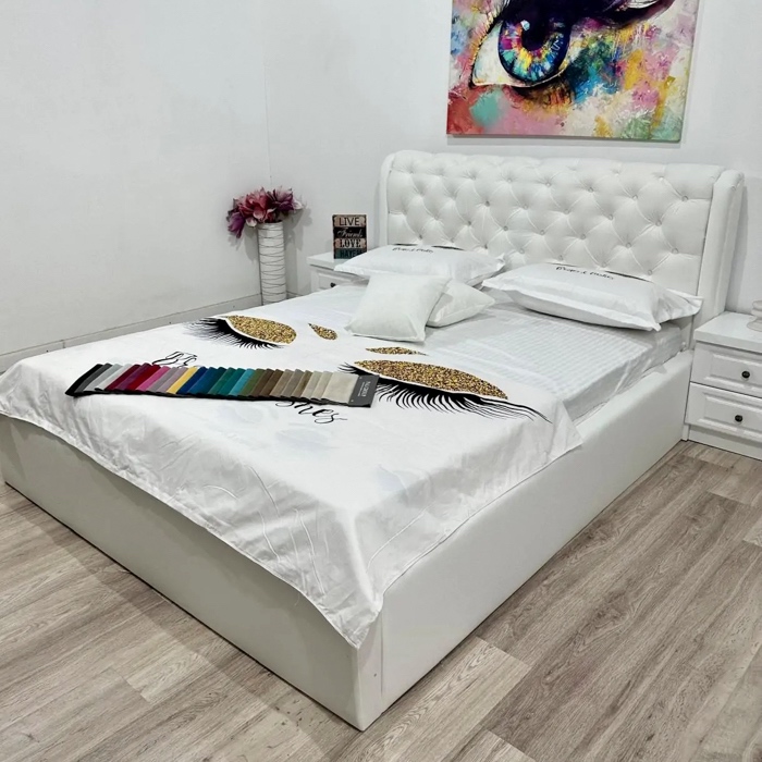 Pat tapitat cu tablie stil Chesterfield din material plusat cu nasturi, somiera metalica rabatabila, lada de depozitare, cadru rezistent realizat din lemn si PAL, pentru saltea de 140 x 200 cm. Acest pat tapitat, cu tablie in stil Chesterfield, este o alegere ideala pentru un dormitor elegant si luxuriant. Tapiteria din material plusat in nuanta calda de turquoise, impreuna cu nasturii de sticla, adauga un plus de rafinament si stil. Somiera metalica rabatabila este e