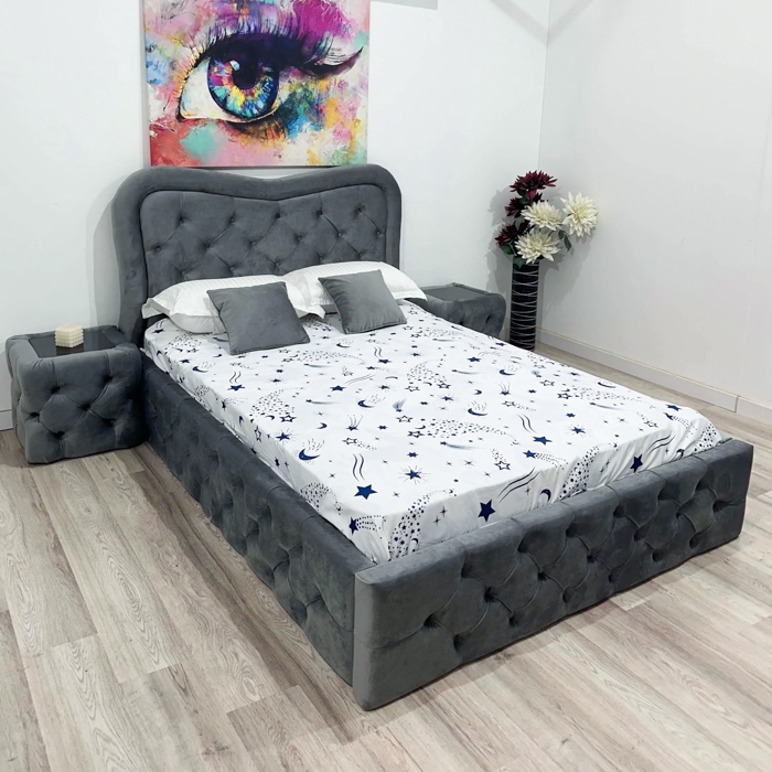 Pat matrimonial cu somiera rabatabila, tapitetie din catifea gri, dimensiuni totale de 155 x 215 cm, tablie inalta de 120 cm cu nasturi imbracati in material, candru pat si tablie stil Chesterfield, structura lemn si PAL, somiera lamele din lemn si rama metal, lada de depozitare. La comanda nasturii pot fi si din sticla. Noptiere la comanda: 500 lei/bucata. Eleganta poate fi palpabila. O poti vedea, o poti atinge si o poti simti in fiecare seara, cand te asezi in acest