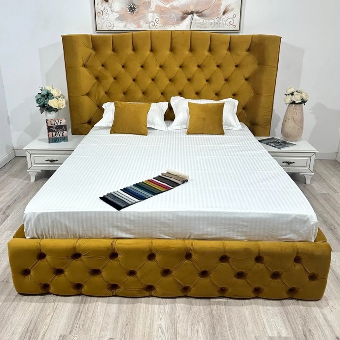 Pat tapitat cu tablie inalta curbata spre interior tip Chesterfield, cu nasturi imbracati in material, nuanta galben-mustar, dimensiune totala de 225 x 175 cm, pentru saltea de 160 x 200 cm, stofa premium rezistenta la apa, somiera rabatabila, cu o lada de depozitare generoasa, structura din lemn si PAL hidrofugat. La comanda se poate realiza si fara somiera, suportul pentru saltea fiind drept, din PAL nemelaminat, sustinut de un sistem tip fagure, foarte rezistent. Patul e