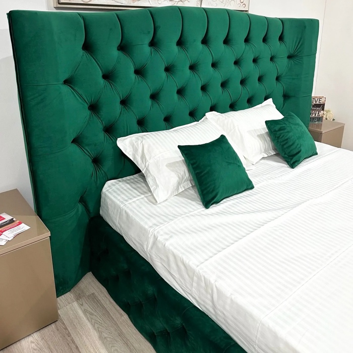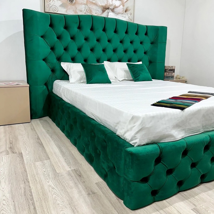Pat tapitat cu tablie inalta curbata spre interior tip Chesterfield, cu nasturi imbracati in material, nuanta galben-mustar, dimensiune totala de 225 x 175 cm, pentru saltea de 160 x 200 cm, stofa premium rezistenta la apa, somiera rabatabila, cu o lada de depozitare generoasa, structura din lemn si PAL hidrofugat. La comanda se poate realiza si fara somiera, suportul pentru saltea fiind drept, din PAL nemelaminat, sustinut de un sistem tip fagure, foarte rezistent. Patul e