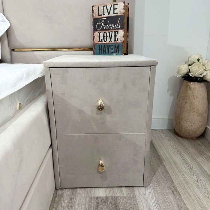 Pat Matrimonial, cu Lada de Depozitare, pentru Saltea de 160x200cm, Tapitat din Catifea cu Accente Metalice, Bej - model MAROC - cu Somiera Rabatabila
