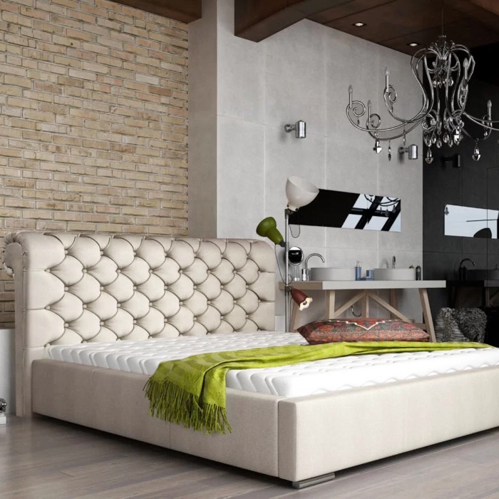 Pat tapitat stofa catifelata crem cu tablie nasturi model Chesterfield prevazut cu somiera cu sistem de ridicare si lada mare pentru lenjerie.     Salteaua nu este inclusa in pret.     La comanda se poate realiza si fara somiera, suportul pentru saltea fiind drept, din PAL nemelaminat, sustinut de un sistem tip fagure, foarte rezistent.     Patul tapitat Karoly este potrivit pentru dormitoarele amenajate in stil modern, intrucat reflecta o eleganta aparte prin cromatica tapiteriei