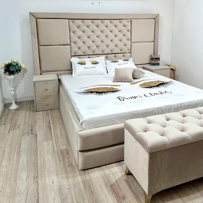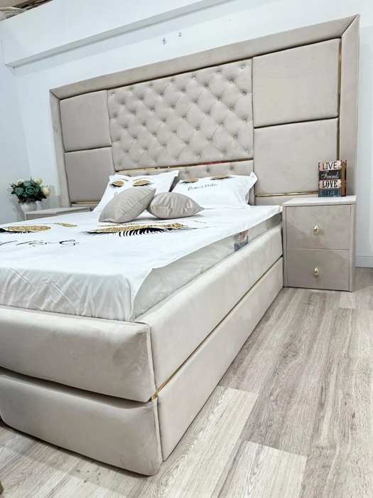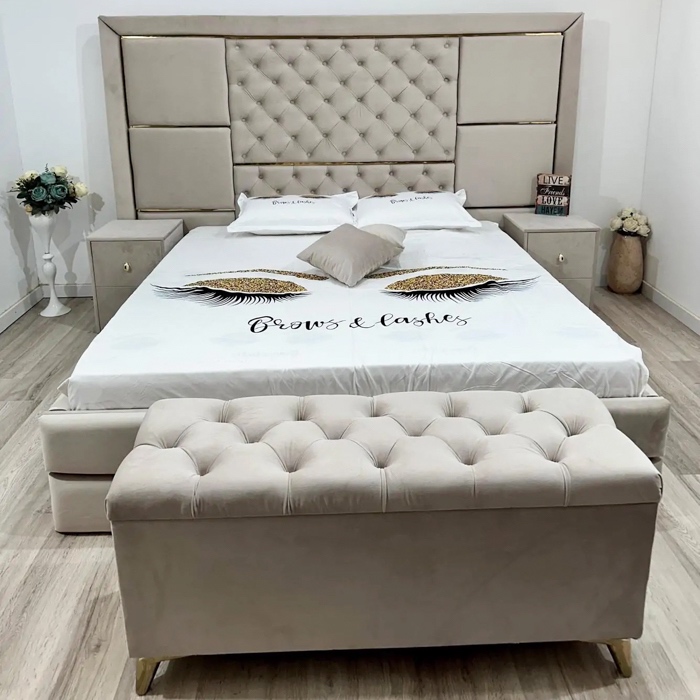 Pat Matrimonial, cu Lada de Depozitare, pentru Saltea de 180x200cm, Tapitat din Catifea cu Accente Metalice, Bej - model MAROC - cu Somiera Rabatabila
