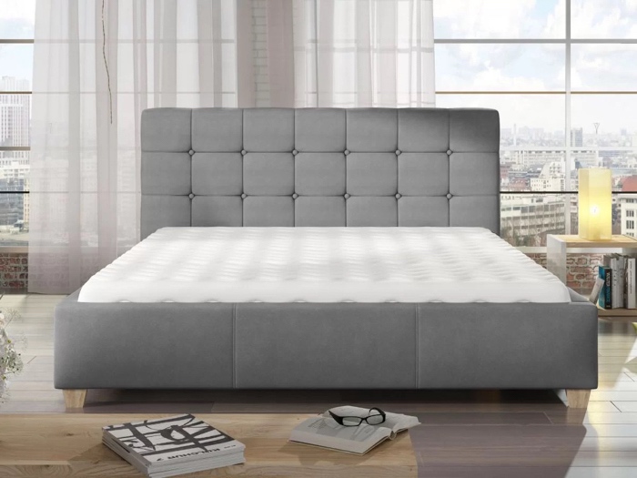 Pat matrimonial cu tablie tapitata cu nasturi, tapiterie din stofa Gri, structura lemn si PAL, lada pentru depozitare, picioare crom.     La comanda se poate realiza si fara somiera, suportul pentru saltea fiind drept, din PAL nemelaminat, sustinut de un sistem tip fagure, foarte rezistent.     Naturaletea, simplitatea si functionalitatea sunt principalele calitati ale acestui pat destinat dormitoarelor matrimoniale.     Un pat spectaculos prin tablia inalta tapitata cu model tip n