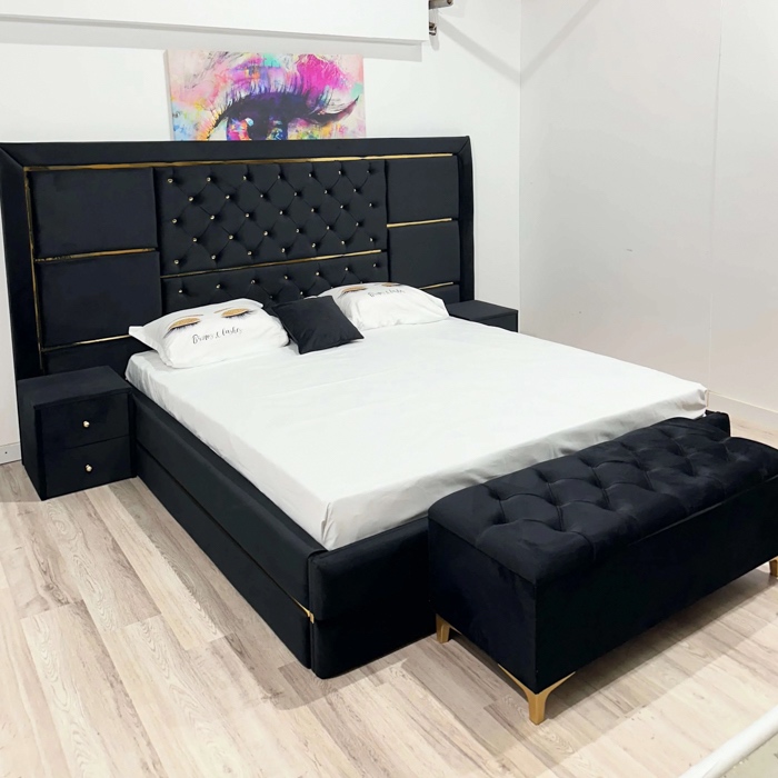 Pat matrimonial de mijloc pentru saltea de 140 x 200 cm, tapiterie in stil Chesterfield cu accesorii aurii, material catifelat verde smarald, somiera rabatabila, lada generoasa de depozitare, structura rezistenta formata din lemn si PAL melaminat, doua noptiere tapitate si un taburet. La comanda, insertiile aurii pot fi inlocuite cu insertii argintii si de asemenea cu accesorii confectionate din stofa, in functie de alegerea dumneavoastra. Dormitorul este spatiul ce necesi