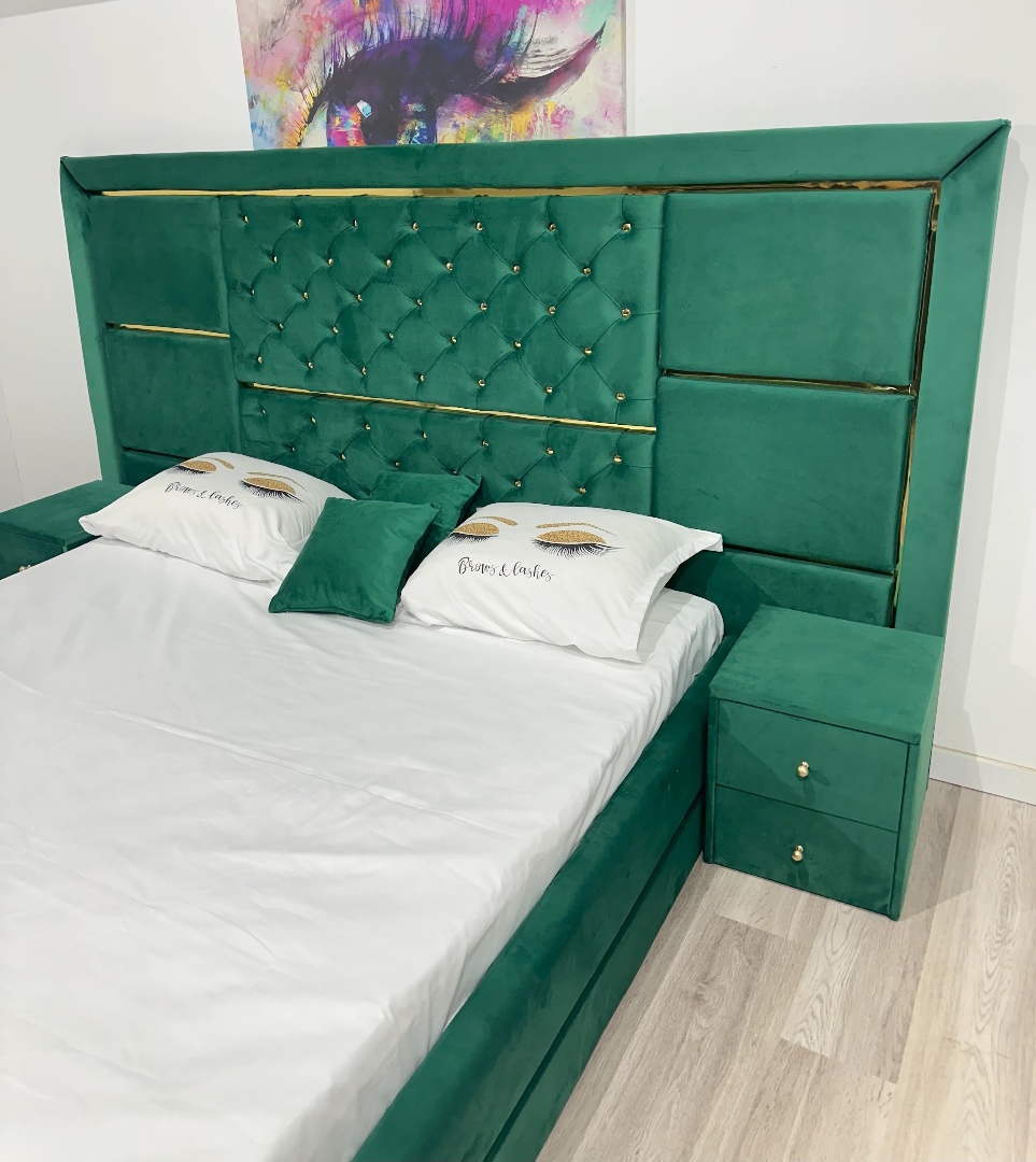Pat matrimonial de mijloc pentru saltea de 140 x 200 cm, tapiterie in stil Chesterfield cu accesorii aurii, material catifelat verde smarald, somiera rabatabila, lada generoasa de depozitare, structura rezistenta formata din lemn si PAL melaminat, doua noptiere tapitate si un taburet. La comanda, insertiile aurii pot fi inlocuite cu insertii argintii si de asemenea cu accesorii confectionate din stofa, in functie de alegerea dumneavoastra. Dormitorul este spatiul ce necesi