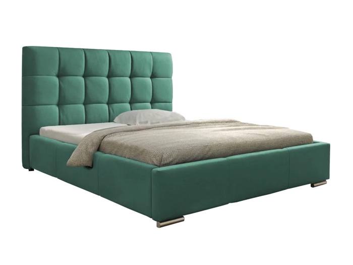 Pat matrimonial cu tablie inalta tip nasturi, tapiterie material plusat mint, structura lemn si PAL, picioare crom si somiera fixa, suportul pentru saltea fiind drept, din PAL nemelaminat, sustinut de un sistem tip fagure, foarte rezistent. Naturaletea, simplitatea si functionalitatea sunt principalele calitati ale acestui pat destinat dormitoarelor matrimoniale. Elementul principal al acestui pat il reprezinta tablia inalta de 120 cm, care are un design deosebit prin nastu