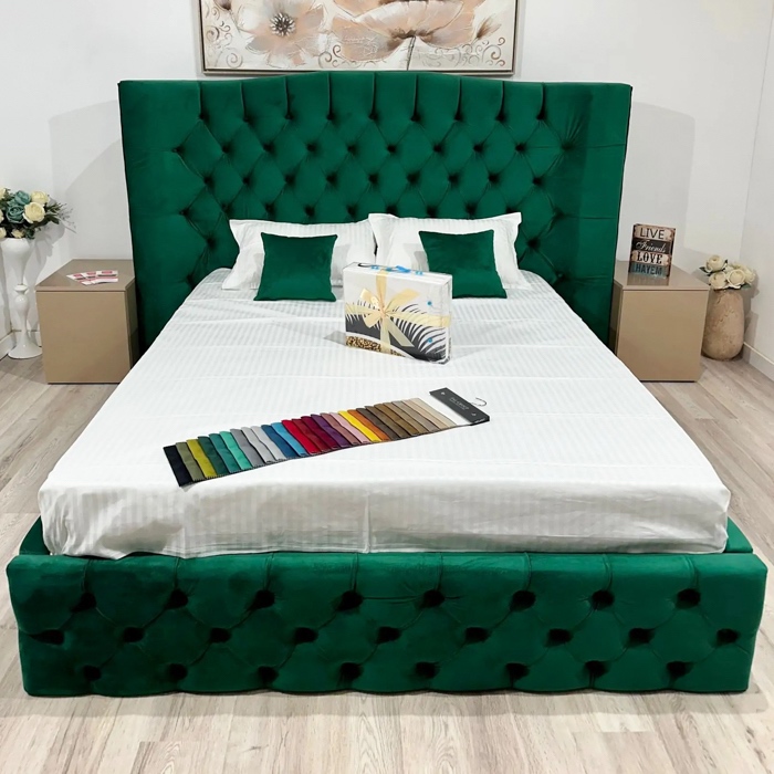 Pat tapitat cu tablie inalta curbata spre interior tip Chesterfield, cu nasturi imbracati in material, nuanta galben-mustar, dimensiune totala de 225 x 195 cm, pentru saltea de 180 x 200 cm, stofa premium rezistenta la apa, somiera fixa, structura din lemn si PAL hidrofugat. Dimensiunile totale ale patului, asigura o prezenta impunatoare in camera, dar pastreaza totodata o nota eleganta si moderna. Salteaua nu este inclusa in pret. Noptierele nu sunt incluse in pret. Subcatego