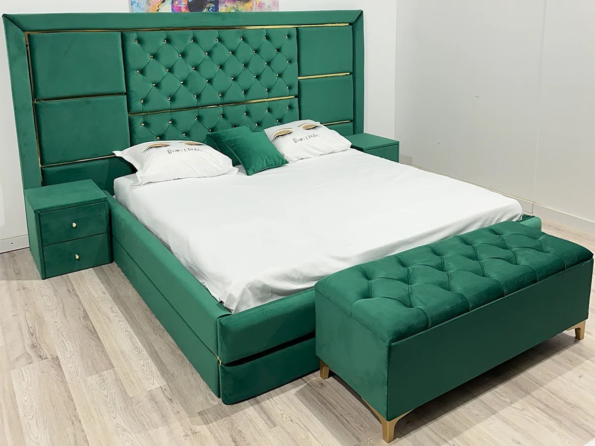 Pat matrimonial de mijloc pentru saltea de 180 x 200 cm, tapiterie in stil Chesterfield cu accesorii aurii, material catifelat verde smarald, somiera rabatabila, lada generoasa de depozitare, structura rezistenta formata din lemn si PAL melaminat, doua noptiere tapitate si un taburet. La comanda, insertiile aurii pot fi inlocuite cu insertii argintii si de asemenea cu accesorii confectionate din stofa, in functie de alegerea dumneavoastra. Dormitorul este spatiul ce necesi