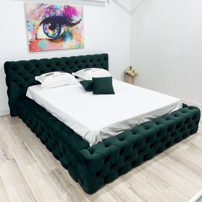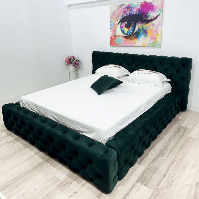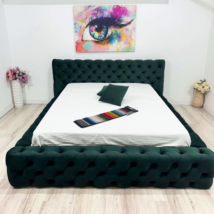 Pat matrimonial in stil Chesterfield cu dimensiuni totale de 180 x 240 cm, pentru saltea de 180 x 200 cm, tapiterie din catifea, tablie inalta de 130 cm, cadru pat 33 cm, somiera metalica rabatabila, lada de depozitare. La comanda nasturii pot fi si imbracati in material. Un dormitor sofisticat merita o piesa centrala care sa impresioneze, iar patul matrimonial Gold cu tablie inalta este definitia luxului si confortului. Tapitat in catifea verde smarald, cu un design stil Chesterfiled