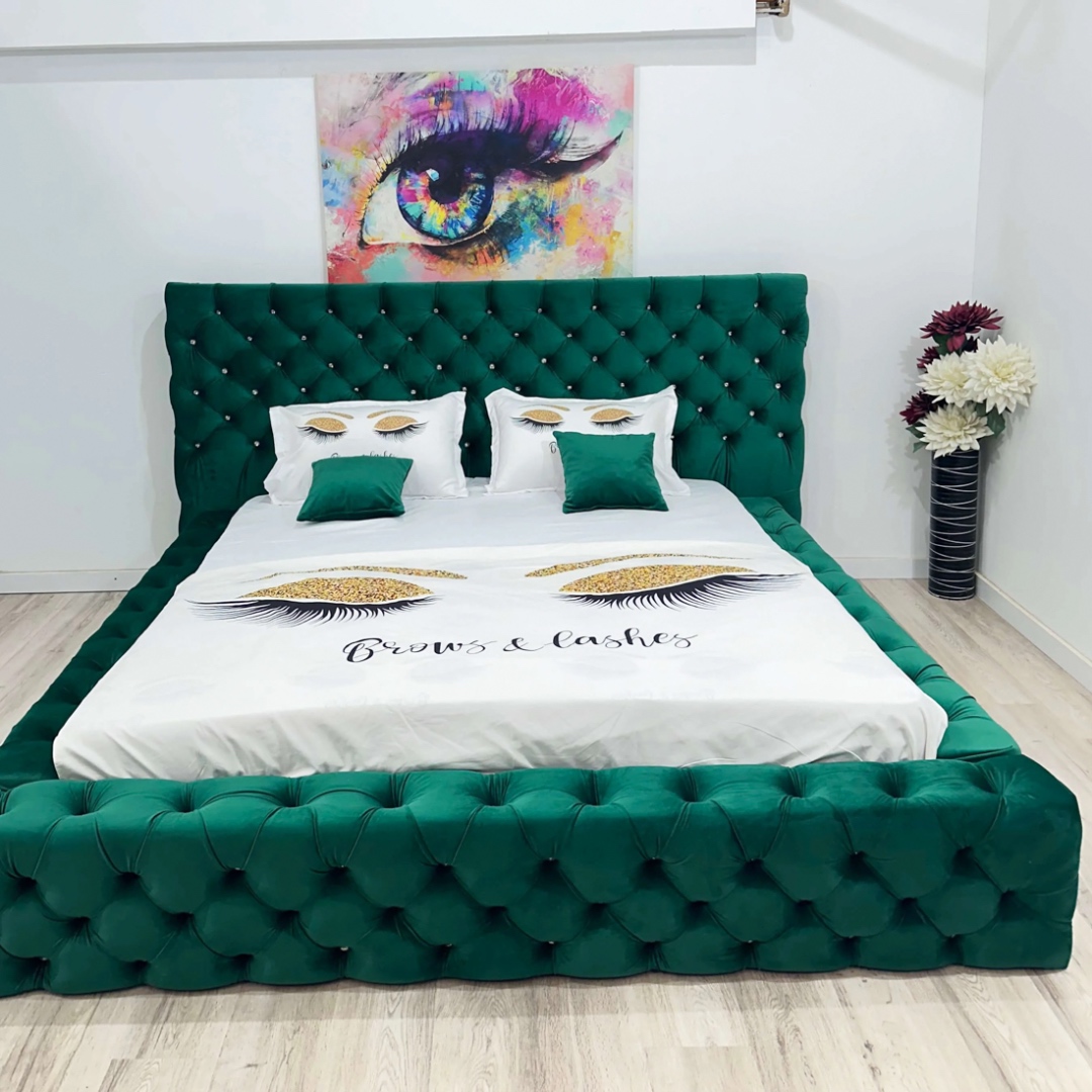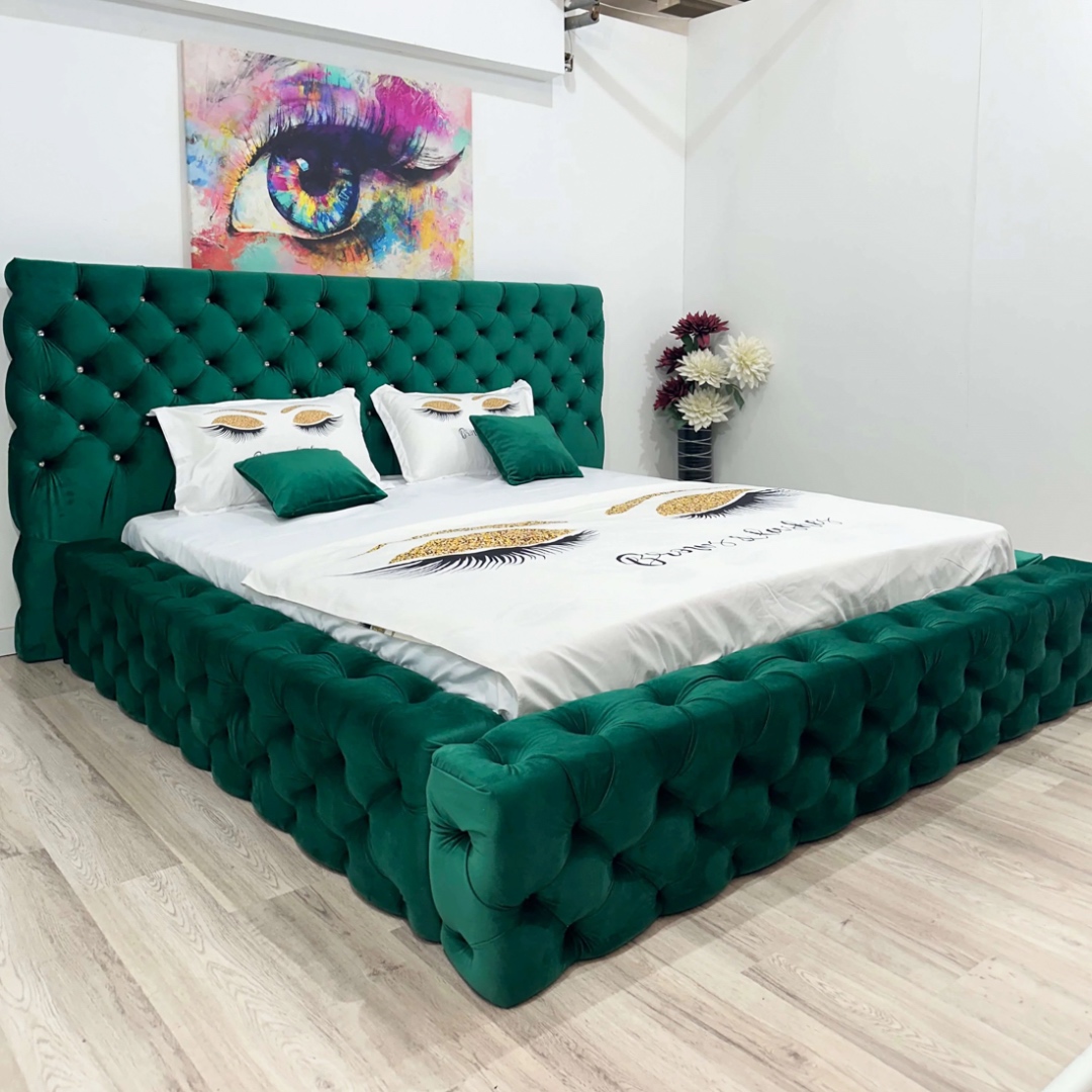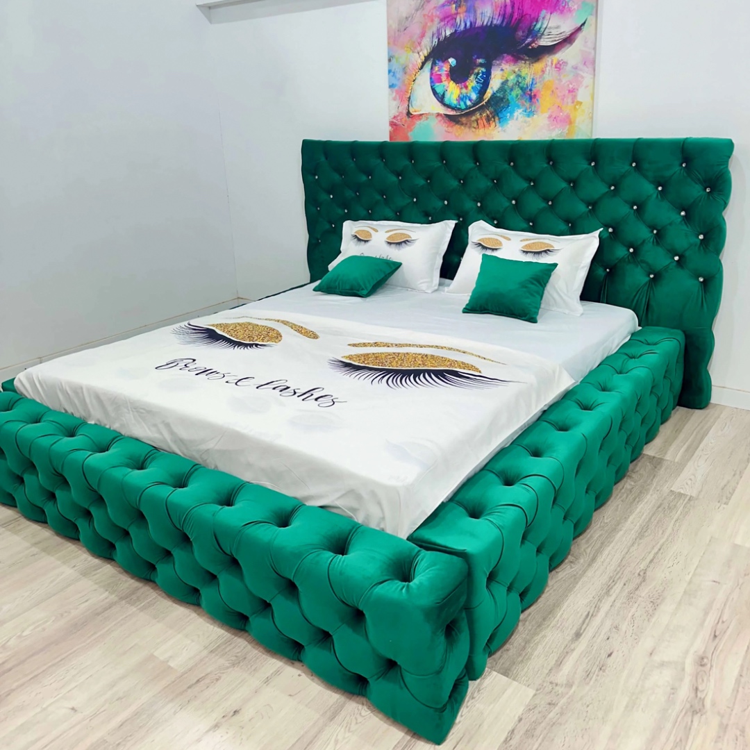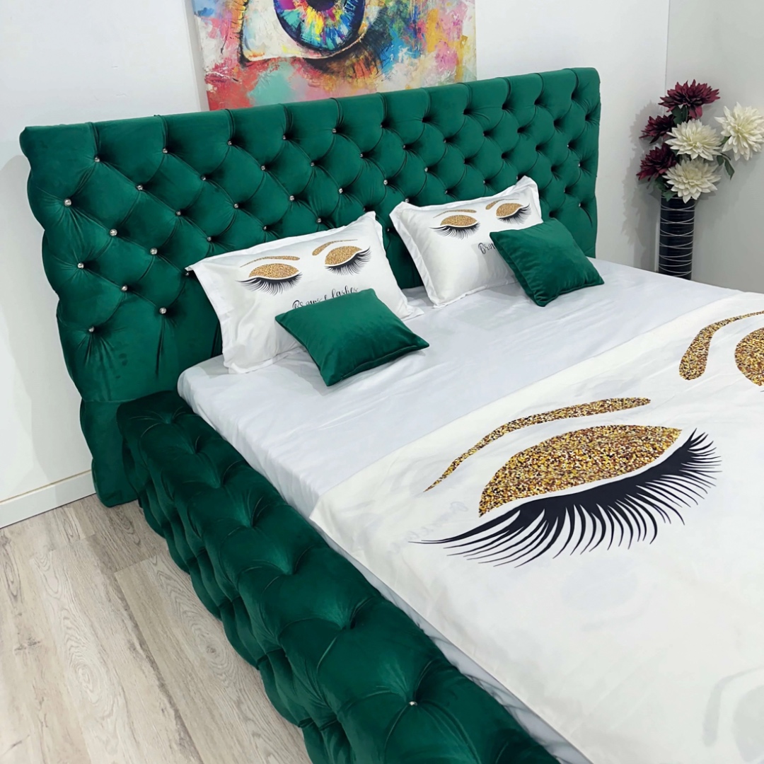 Pat matrimonial in stil Chesterfield cu dimensiuni totale de 240 x 240 cm, pentru saltea de 180 x 200 cm, tapiterie din catifea, tablie inalta de 130 cm, cadru pat 33 cm, somiera metalica rabatabila, lada de depozitare. La comanda nasturii pot fi si imbracati in material. Un dormitor sofisticat merita o piesa centrala care sa impresioneze, iar patul matrimonial Gold cu tablie inalta este definitia luxului si confortului. Tapitat in catifea verde smarald, cu un design stil Chesterfiled