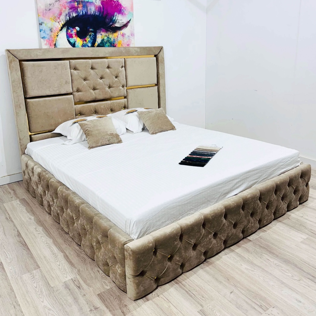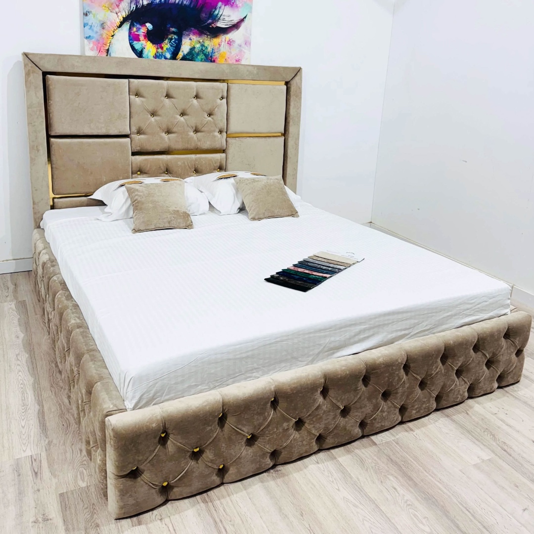 Pat matrimonial de mijloc pentru saltea de 160 x 200 cm, tablie inalta de 160 cm, tapiterie in stil Chesterfield cu accesorii aurii, nasturi decorativi aurii, material catifelat nuanta mocha mousse, somiera rabatabila, lada generoasa de depozitare, structura rezistenta formata din lemn si PAL. Redefineste eleganta dormitorului matrimonial cu patul tapitat Casablanca, o piesa de mobilier statement, creata pentru a impresiona din orice unghi. Acest pat tapitat se remarca prin des