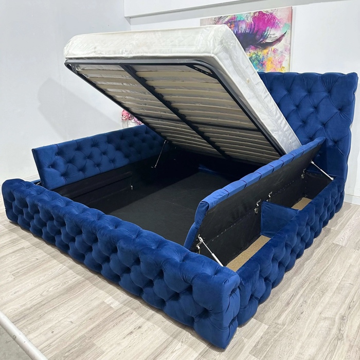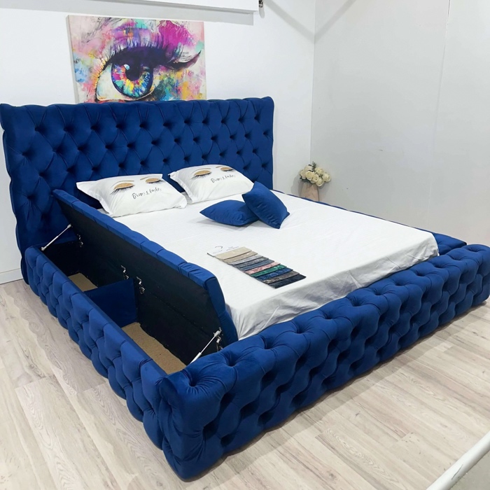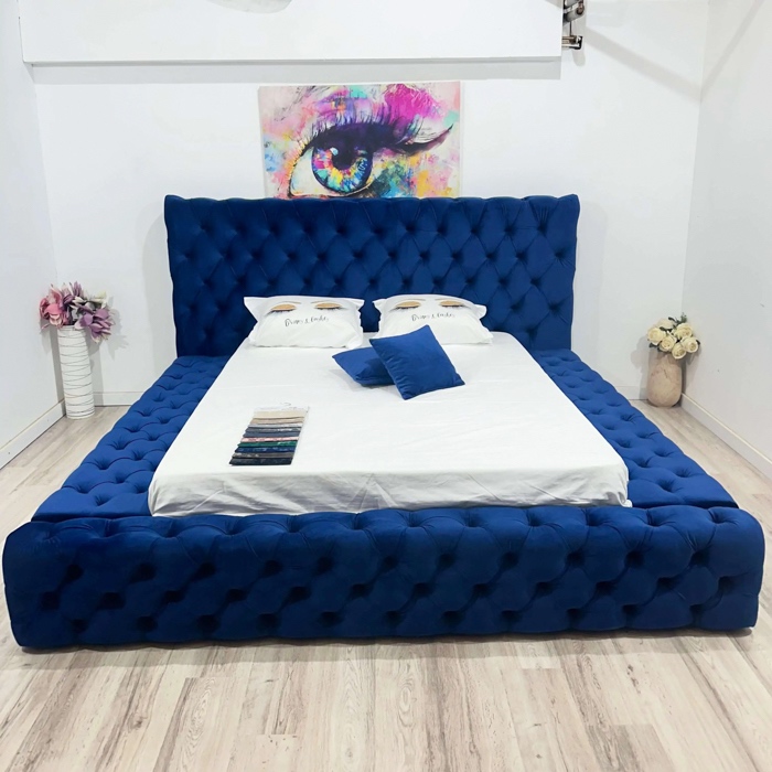 Pat tapitat in stil Chesterfield pentru saltea de 160 x 200 cm, nasturi imbracati in material (la comanda acestia pot fi si de sticla), tapiterie din catifea fina, depozitare inteligenta in bratele laterale, lada de depozitare spatioasa sub pat prin somiera rabatabila., structura lemn si PAL. Patul Dubai – lux si rafinament in dormitorul tau. In inima dormitorului tau, patul Dubai straluceste ca un simbol al luxului si elegantei. Tapitat cu un material catifelat, de o textura