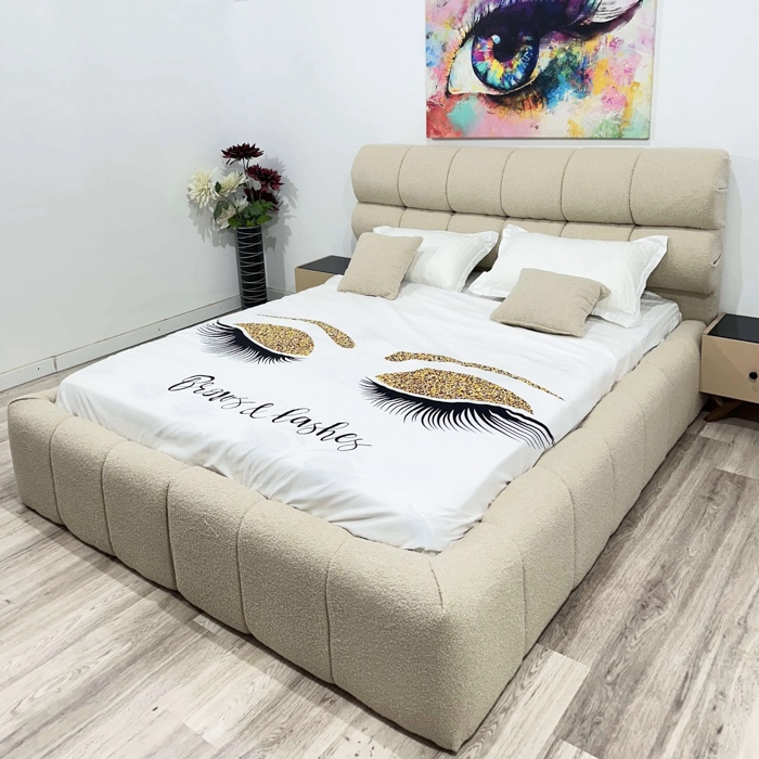 Pat Tapitat, pentru Saltea de 180x200cm, Material Buclat, Crem - model ENZO - cu Somiera Fixa