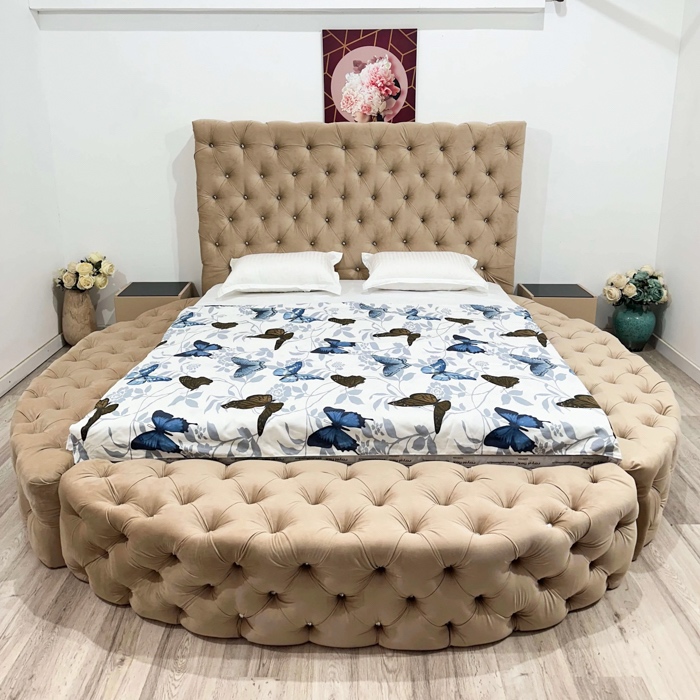 Pat tapitat rotund in stil Chesterfield, material catifelat bej cu nasturi, structura rezistenta, formata din lemn si PAL melaminat, somiera rabatabila cu lada de depozitare, dimensiunea saltelei de 140 x 200 cm. Acest pat tapitat rotund in stil Chesterfield este o piesa de mobilier deosebita, care se remarca printr-un design clasic si luxuriant, potrivit pentru dormitoarele spatioase. Realizat dintr-un material catifelat de inalta calitate, intr-o nuanta sofisticata, patu