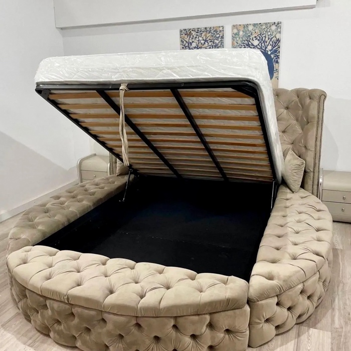 Pat tapitat rotund in stil Chesterfield, material catifelat cappuccino cu nasturi, structura rezistenta, formata din lemn si PAL melaminat, somiera rabatabila cu lada de depozitare, dimensiunea saltelei de 140 x 200 cm. Acest pat tapitat rotund in stil Chesterfield este o piesa de mobilier deosebita, care se remarca printr-un design clasic si luxuriant, potrivit pentru dormitoarele spatioase. Realizat dintr-un material catifelat de inalta calitate, intr-o nuanta sofisticat
