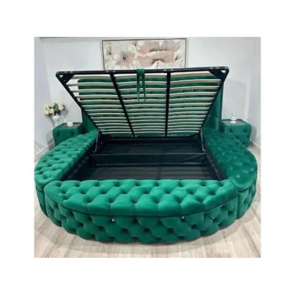Pat tapitat rotund in stil Chesterfield, material catifelat verde smarald cu nasturi de sticla, structura rezistenta, formata din lemn si PAL melaminat, somiera rabatabila cu lada de depozitare, dimensiunea saltelei de 140 x 200 cm. Acest pat tapitat rotund in stil Chesterfield este o piesa de mobilier deosebita, care se remarca printr-un design clasic si luxuriant, potrivit pentru dormitoarele spatioase. Realizat dintr-un material catifelat de inalta calitate, intr-o nuan