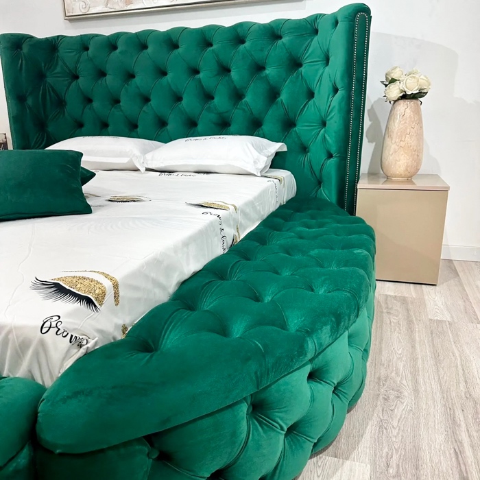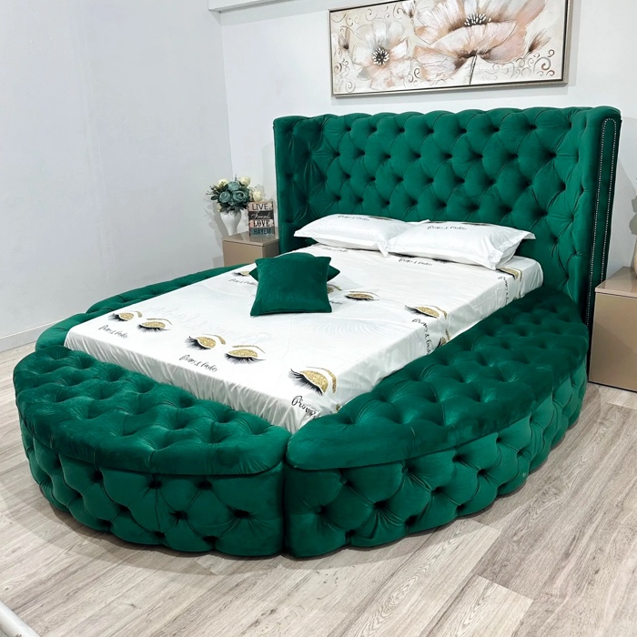 Pat tapitat rotund in stil Chesterfield, material catifelat verde smarald cu nasturi imbracati, structura rezistenta, formata din lemn si PAL melaminat, somiera rabatabila cu lada de depozitare, dimensiunea saltelei de 140 x 200 cm. Acest pat tapitat rotund in stil Chesterfield este o piesa de mobilier deosebita, care se remarca printr-un design clasic si luxuriant, potrivit pentru dormitoarele spatioase. Realizat dintr-un material catifelat de inalta calitate, intr-o nuan