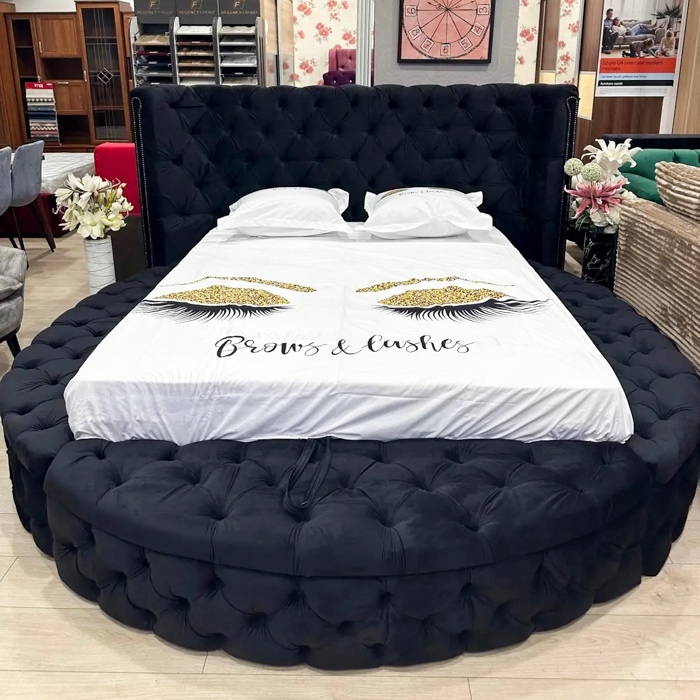Pat tapitat rotund in stil Chesterfield, material catifelat cu nasturi, structura rezistenta, formata din lemn si PAL melaminat, somiera fixa, dimensiunea saltelei de 180 x 200 cm , dimensiuni finale 285 x 255 cm. Acest pat tapitat rotund in stil Chesterfield este o piesa de mobilier deosebita, care se remarca printr-un design clasic si luxuriant, potrivit pentru dormitoarele spatioase. Realizat dintr-un material catifelat de inalta calitate, intr-o nuanta sofisticata de v