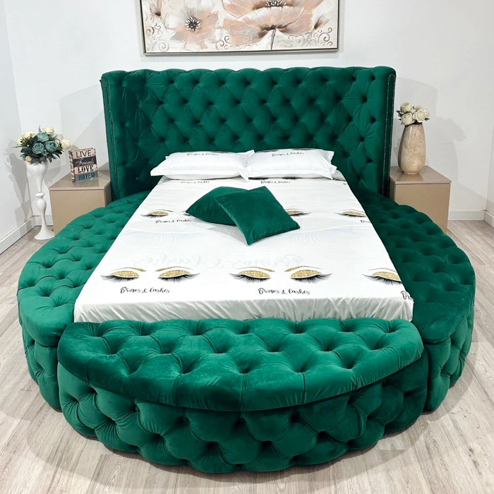 Pat tapitat rotund in stil Chesterfield, material catifelat verde smarald cu nasturi imbracati, structura rezistenta, formata din lemn si PAL melaminat, somiera rabatabila cu lada de depozitare, dimensiunea saltelei de 180 x 200 cm , dimensiuni finale 285 x 255 cm. Acest pat tapitat rotund in stil Chesterfield este o piesa de mobilier deosebita, care se remarca printr-un design clasic si luxuriant, potrivit pentru dormitoarele spatioase. Realizat dintr-un material catifelat de