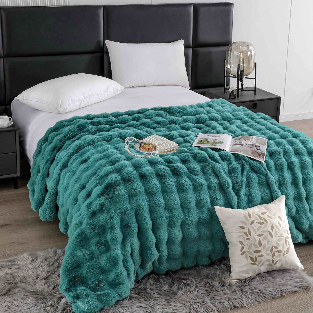 Patura Luxury Soft Touch, Jojo Home, cu Blanita Artificiala Tip Iepure, 200x230 cm, cu Fermoar, Turquoise
