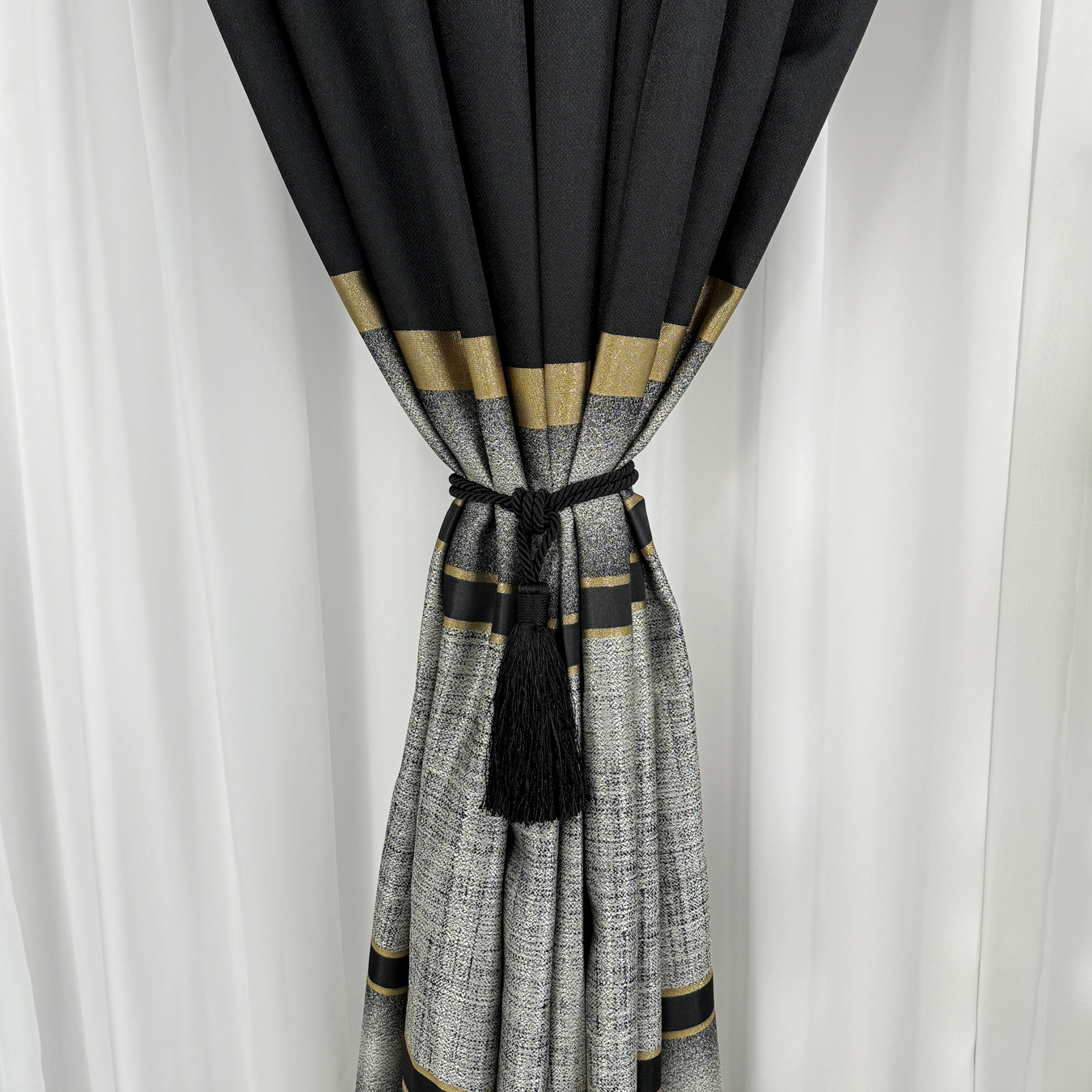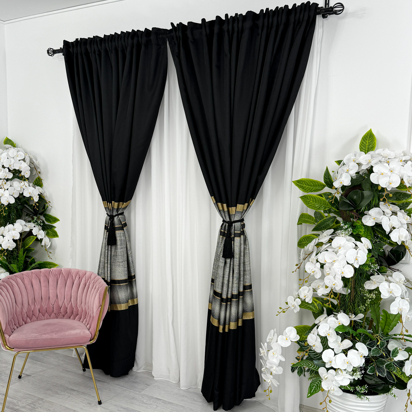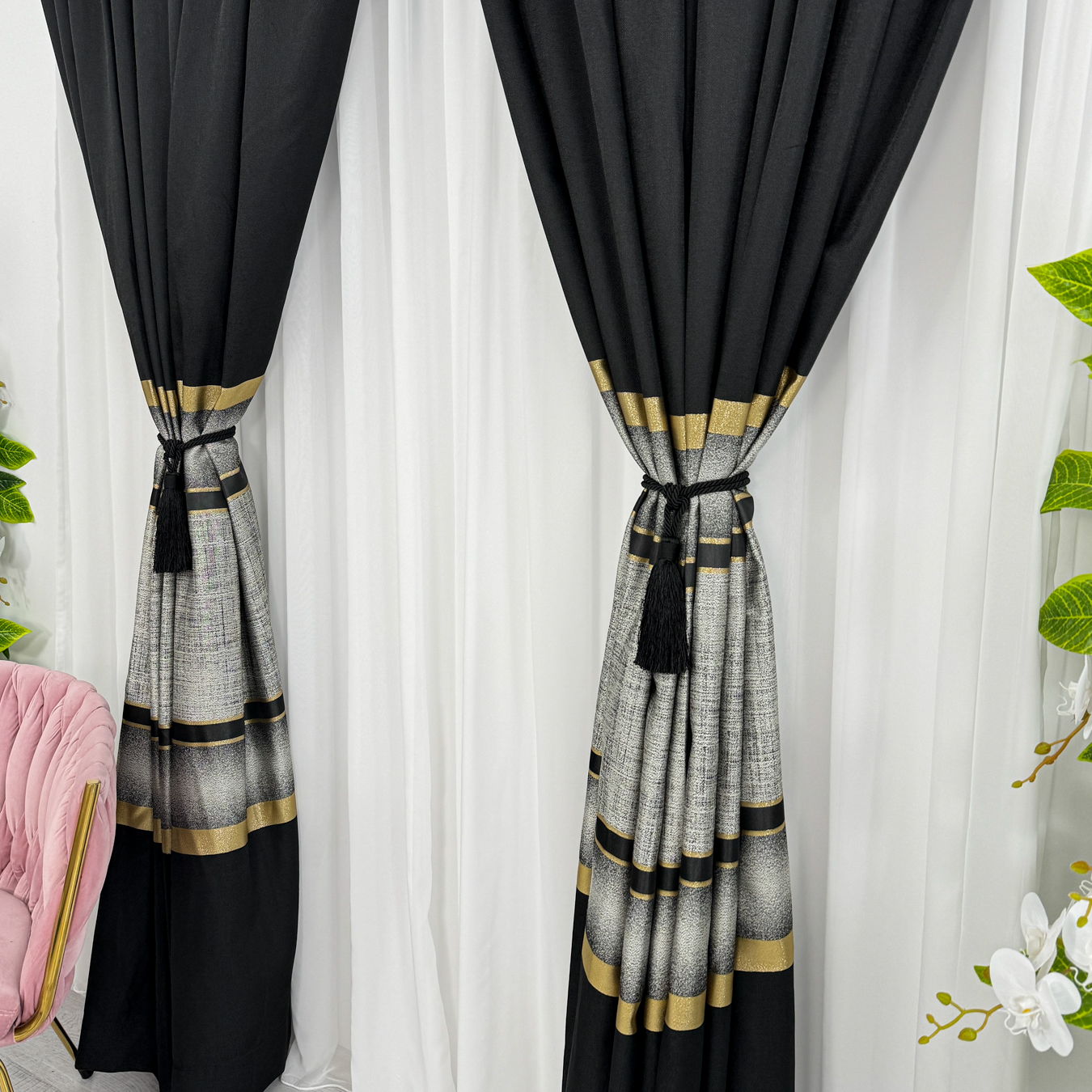 Set 2 Draperii Elite, tip panou 3 metri latime x 232cm inaltime , Rejansa pt bara ,Negru cu Auriu